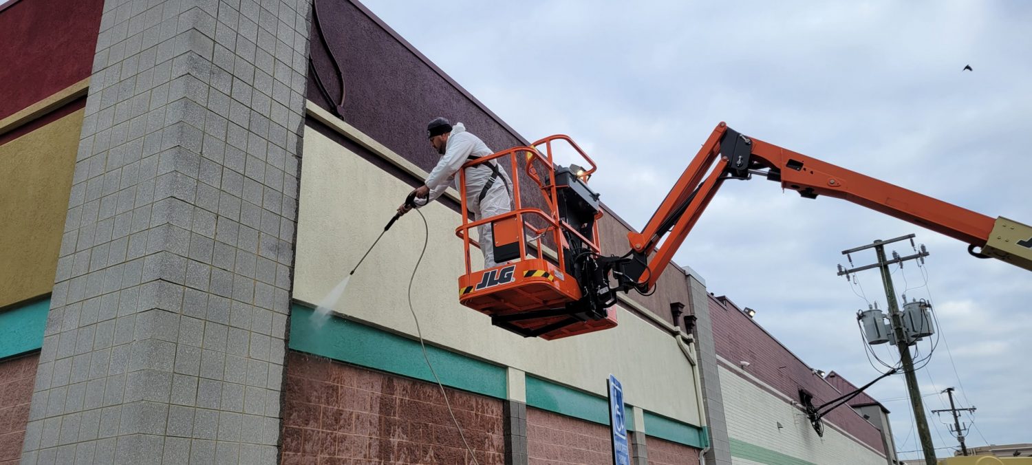 The building, a large grocery store, is in operation from 8am to 9pm, seven days a week. The building exterior extended up to 35 feet in some area, so a 45-foot boom lift was rented to reach the higher areas of the building. The building conditions along with winter weather conditions presented a number of challenges. The surface of the building is a combination of masonry and stucco that has a multi color layout. The manager wanted the building painted even though it was nearly the start of winter. He hoped good weather would allow the team to finish prior to the Christmas holiday.