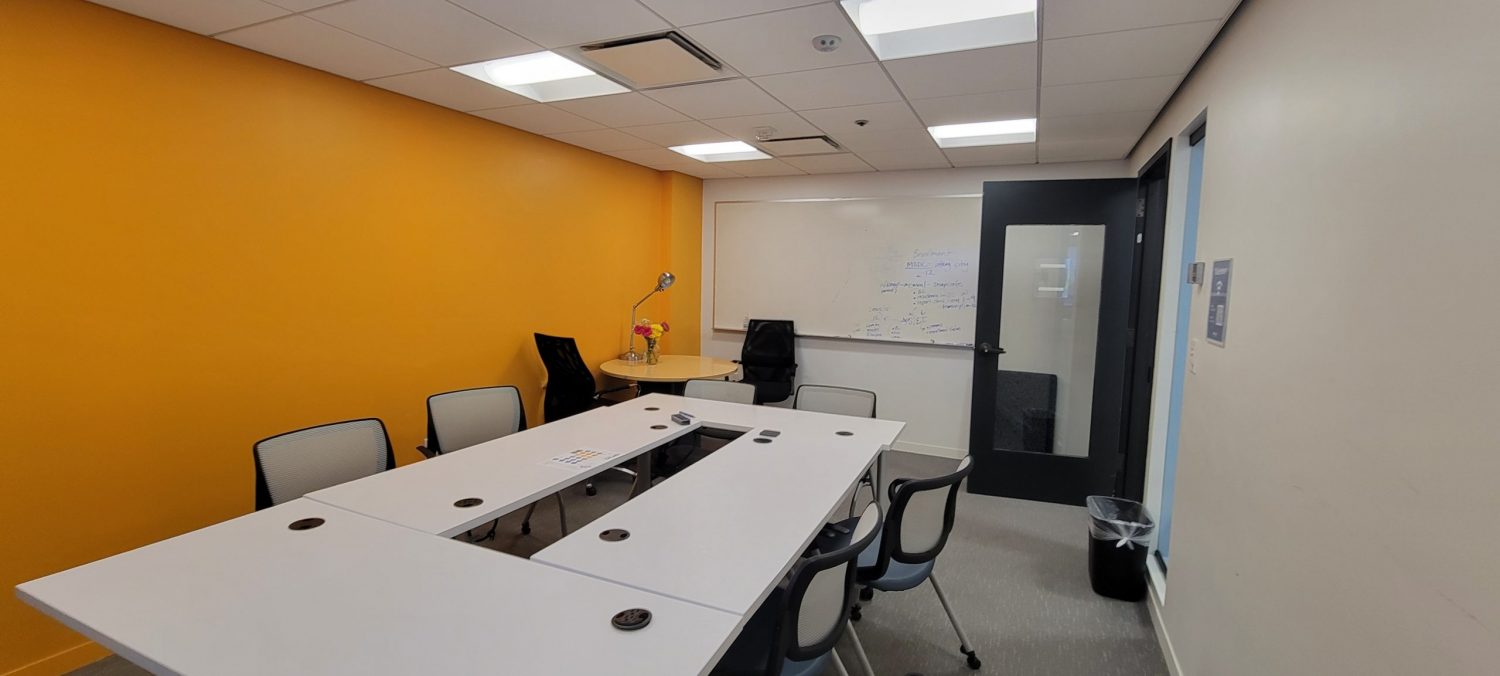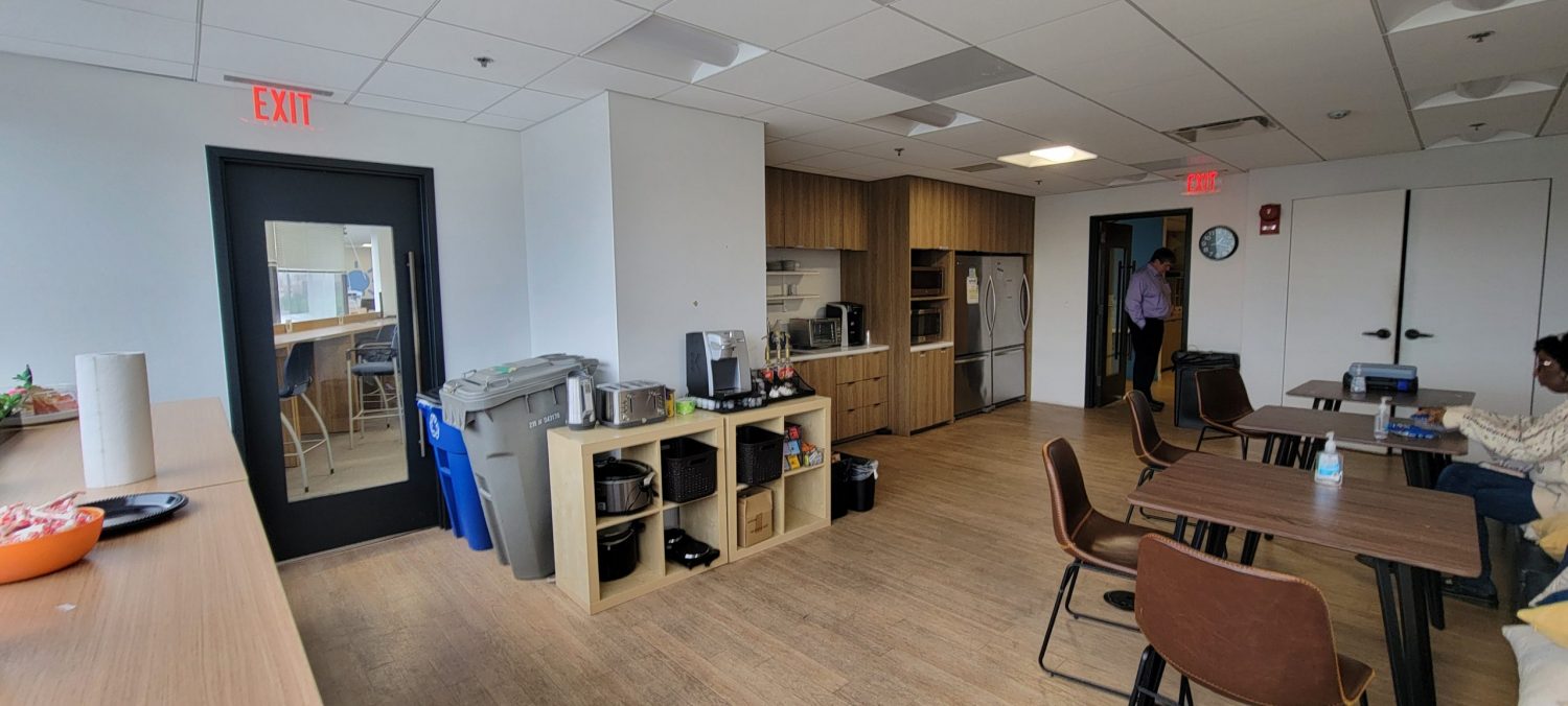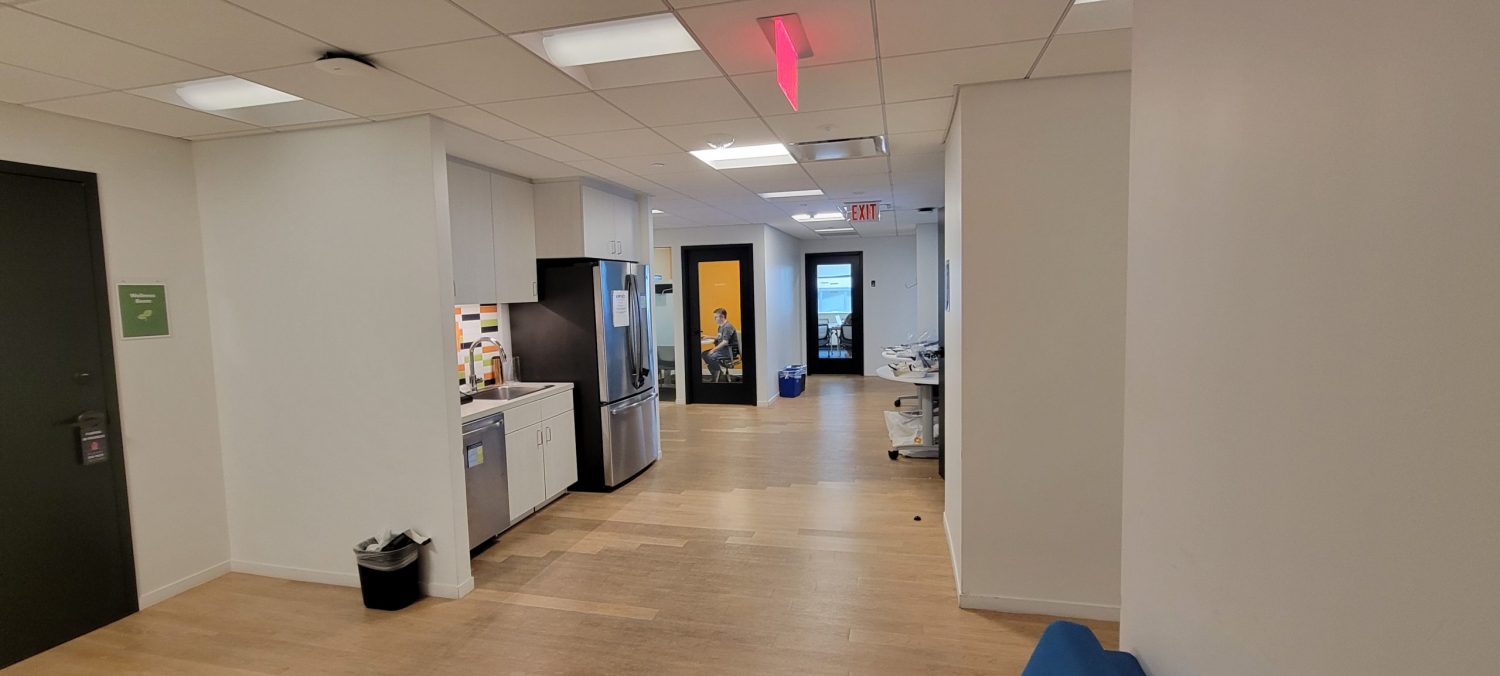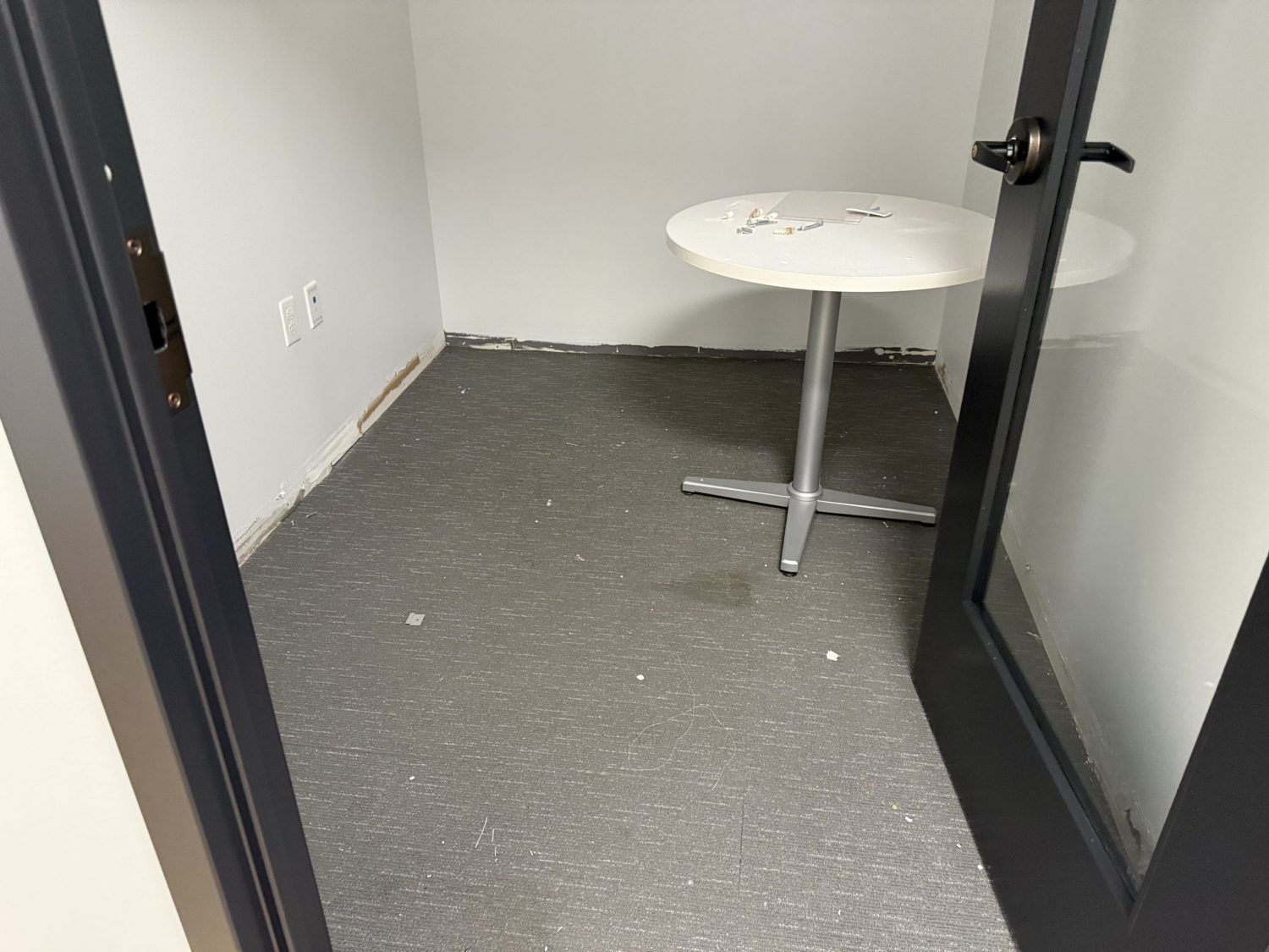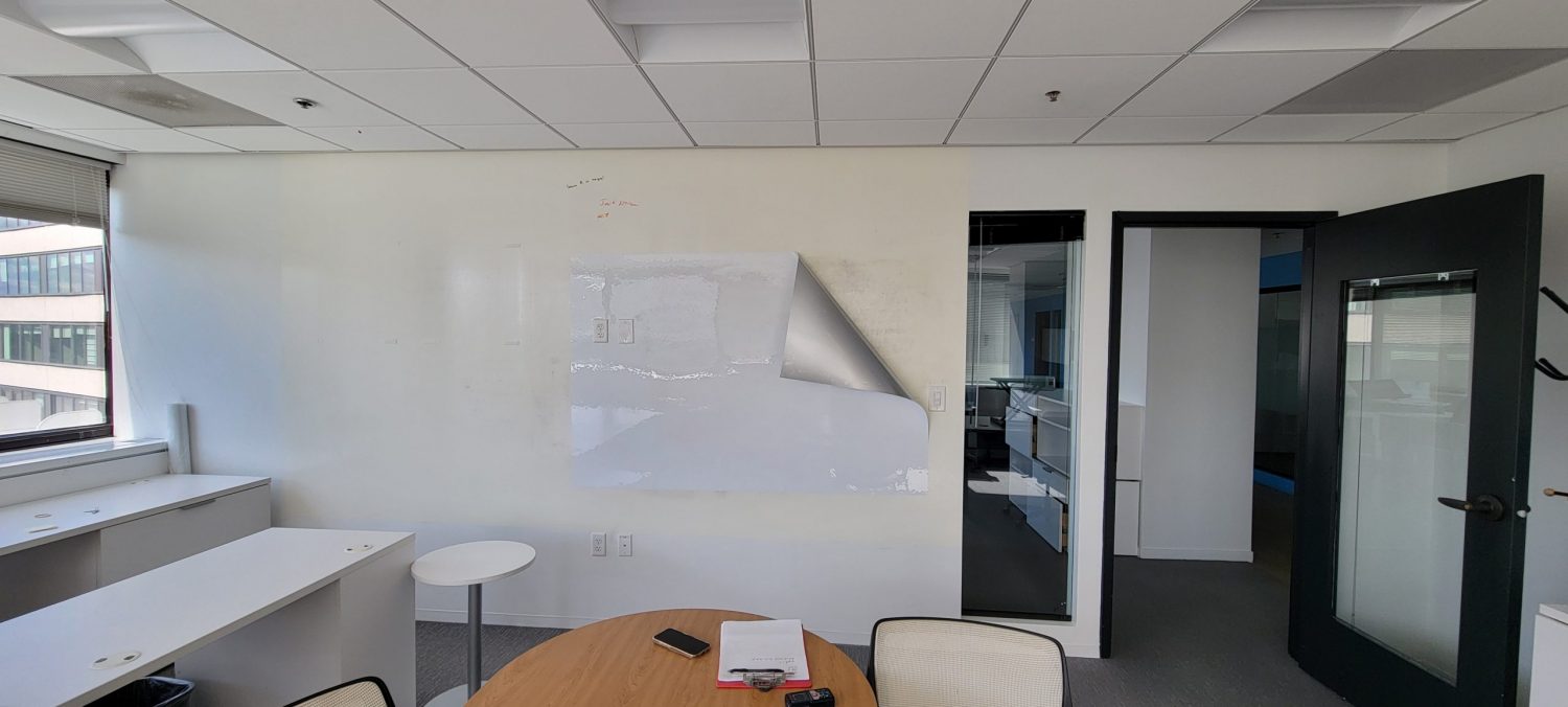 At the start of the project, the space required a complete interior repaint and significant reconfiguration. Existing baseboards were removed to accommodate new flooring, while corkboards, whiteboards, and whiteboard-painted wall surfaces needed to be carefully removed. In several areas, the removal of corkboard installations required full drywall sheet replacement, along with additional drywall repairs throughout the floor.