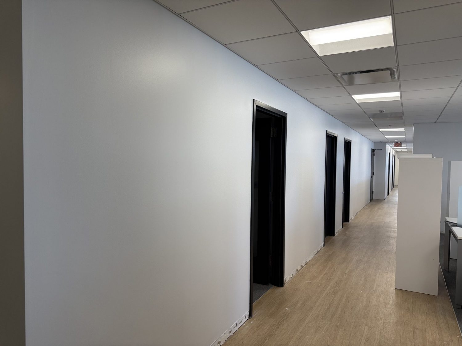 One of the primary challenges involved removing walls coated with whiteboard paint, which required specialized preparation to ensure proper adhesion of new coatings. In areas where corkboards had been installed, full drywall replacement was necessary to restore clean wall surfaces suitable for a professional office environment. Coordinating these repairs while maintaining efficiency and quality was critical to keeping the project on schedule.
