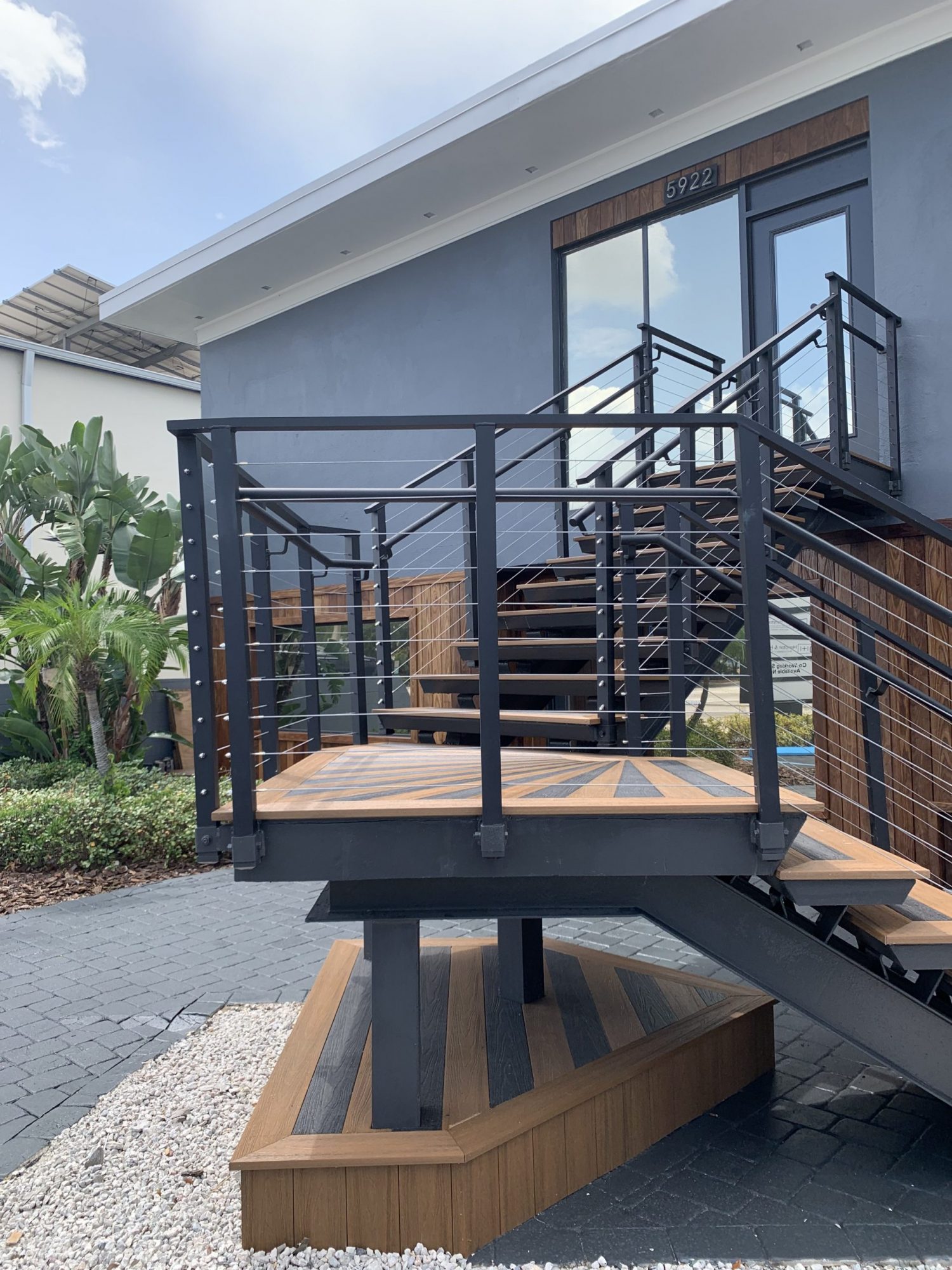 We began the renovation process by scraping off the peeling paint and completely removing the rust stains. As we shifted our attention to the staircases, we encountered a challenging task. Coordinating between the metalworking company assisting with the staircase rehabilitation and the facility owners proved to be tricky, but our team handled it skillfully by coordinating time frames and meeting deadlines effectively. We installed decorative wooded linings and stair landings, along with a new coat of paint to completely revitalize the two staircases. The rest of the facility also underwent a transformation with a fresh coat of paint. Additionally, we stained the surrounding wooden fences and applied weather stripping to the doors, as well as weather sealing to the windows to enhance energy efficiency. To add a unique touch to the building’s appearance, we decided to remove the decorative rock and opted for more creative design choices. Our team brought in talented muralists to create a custom wall featuring the company’s QR code, adding an artistic touch to the front stairs with composite planking, making the facility stand out in a captivating way.
