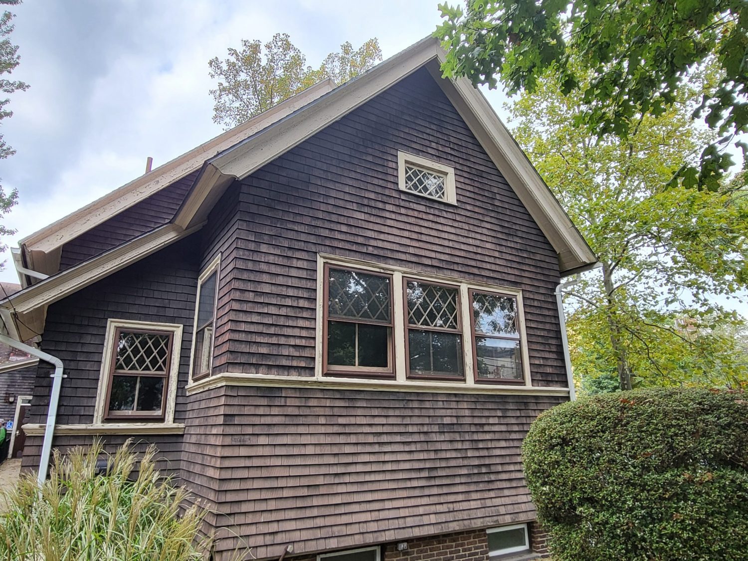 Process: Our team began with a low-pressure power wash on the cedar shingles and trim. Once the surfaces were clean, we replaced any damaged or missing pieces. The trim had some loose and peeling paint that we scraped and removed. We caulked all gaps and holes, and once the area was prepped, we applied a solid stain to the shingles and an exterior wood primer to the trim followed by an exterior latex paint.