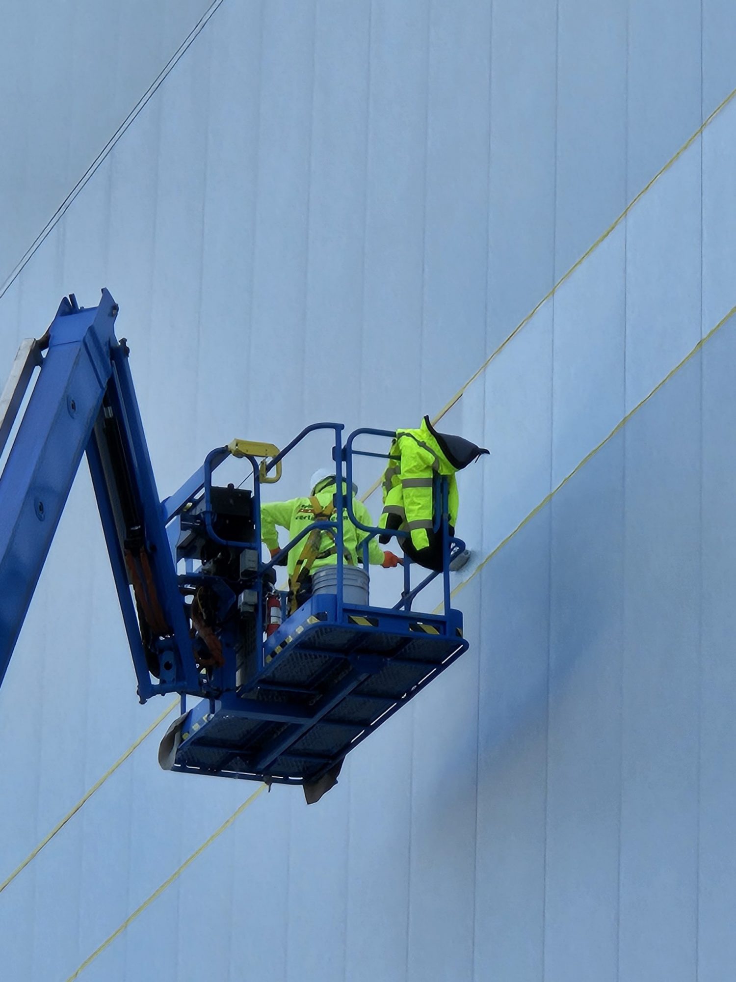 In addition to access issues, the project faced constant high winds, which posed difficulties for exterior work. Spraying, which is a typical method for large-scale projects, was not feasible in certain areas due to the wind. As a result, the team employed rolling and brushing techniques to ensure the paint was applied evenly and with precision.