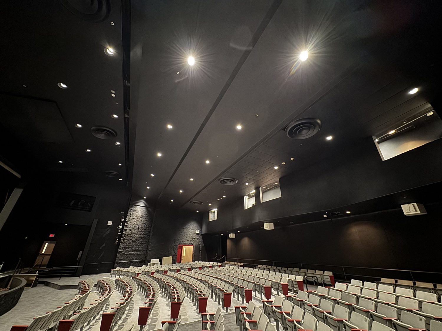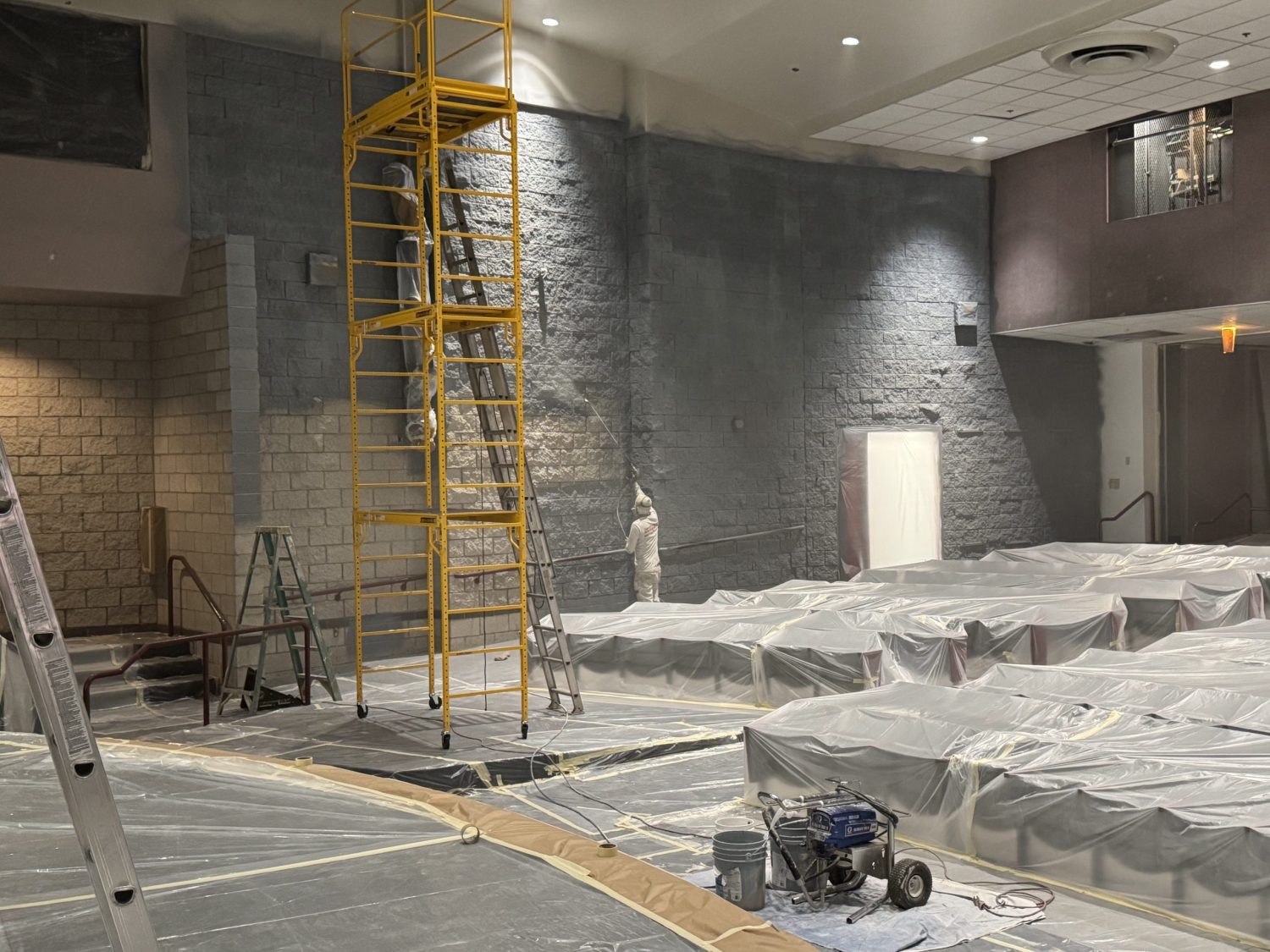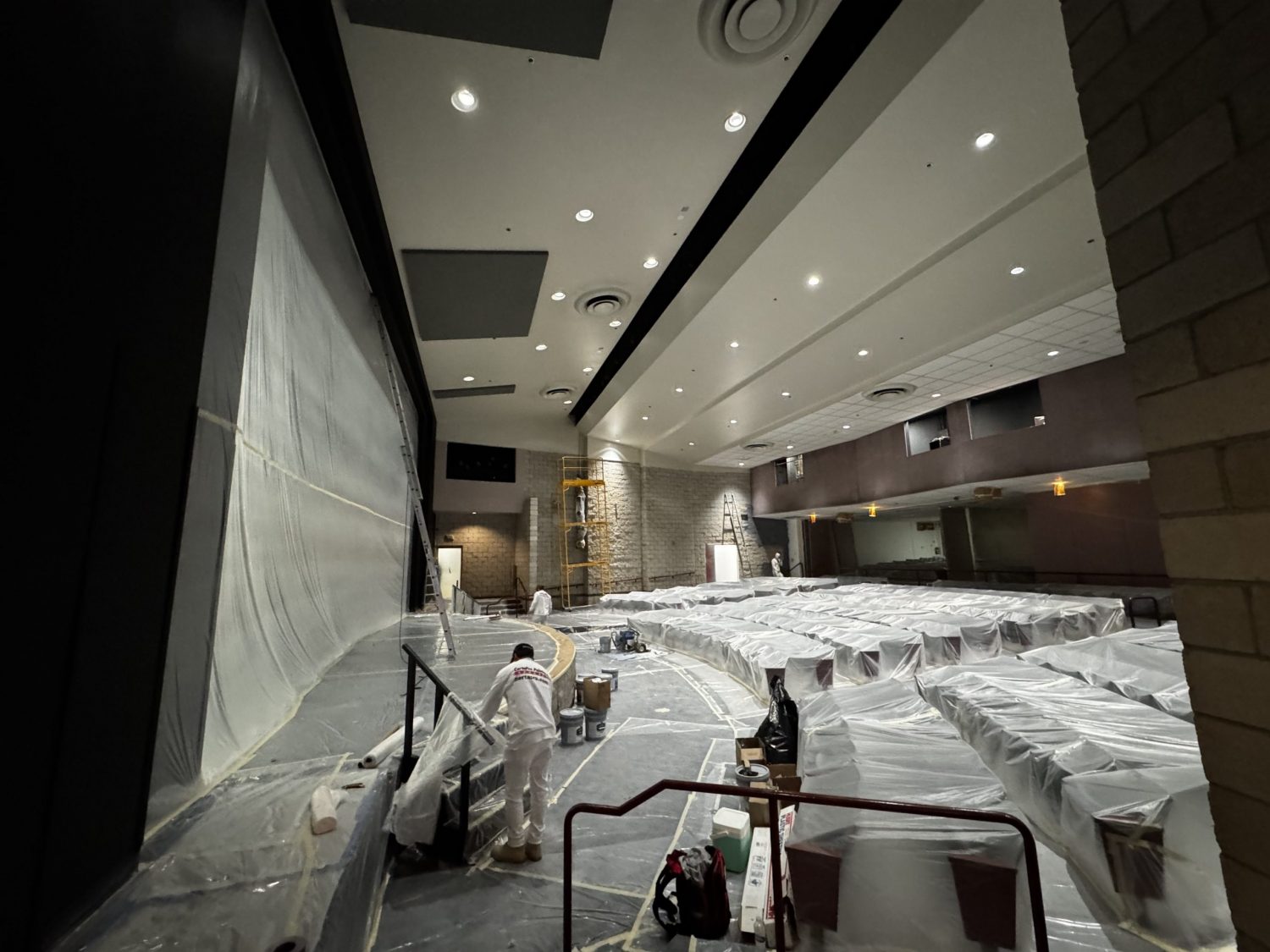 This project involved several logistical and technical challenges. The theater remained in use, meaning painters had to operate around student schedules, restricted access times, and a strict sequence dictated by ongoing school activities. The sloped flooring and 35-foot ceilings required careful ladder and equipment placement, while the painted-black lighting fixtures created low-visibility conditions that complicated detailed work.