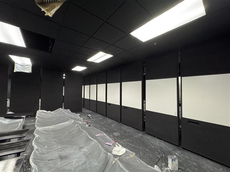 Our crew also completed drywall repairs, refinished fabric wall partitions, and applied high-quality coatings designed for institutional performance spaces. Painting acoustic panels and false ceiling tiles required controlled technique to preserve their functionality while improving appearance. The entire theater was brought back to a clean, modern condition suitable for school events, performances, and instruction.