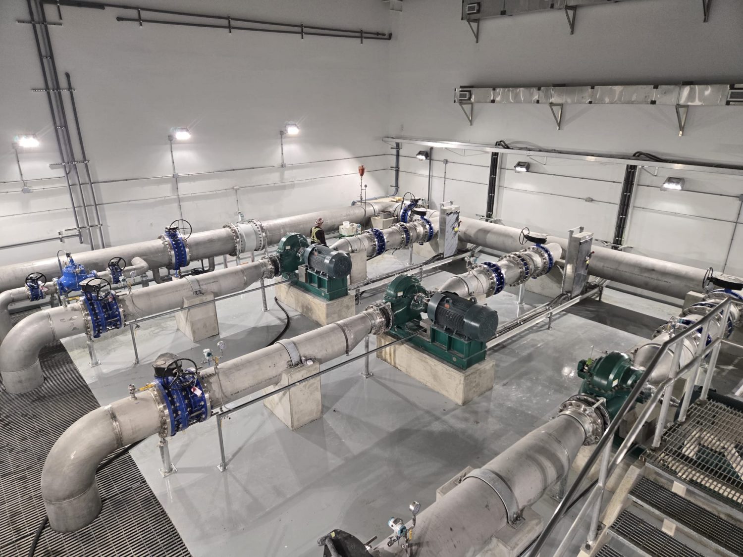 Tight working conditions around installed pump systems and large filtration piping demanded detailed masking, controlled dust management, and precision application. Winter conditions required the use of external heating and ventilation equipment to maintain proper curing temperatures. Despite the logistical challenges, the project was completed on schedule, delivering a durable, chemical-resistant flooring system designed for long-term performance in a demanding utility environment.