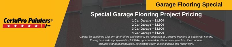 Cannot be combined with any other offers and can only be redeemed at CertaPro Painters of Southwest Florida. Pricing is based on polyaspartic / full flake - guaranteed for life to never peel from the concrete. Includes standard preparation, no existing cover, minimal patch and repair work.