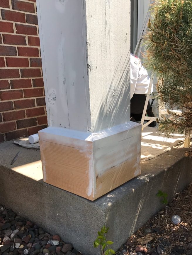 In May 2020, CertaPro Painters® of Twin Cities East acquired the opportunity to repair a beam of a residential entranceway in Maplewood, MN. The pole, located near the front door, is the main accent beam of the home. Weathered and rotting, the support required repair and replacement of wood around the base for a proper restoration. Taking two hours from start to finish, the project was completed. The professionals at CertaPro Painters® of Twin Cities East are equipped to handle not only your house’s painting needs, but can also help replace failing sections of your home with premium services.