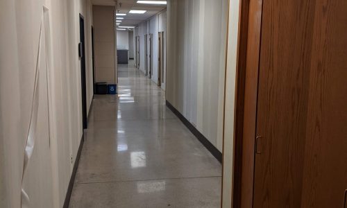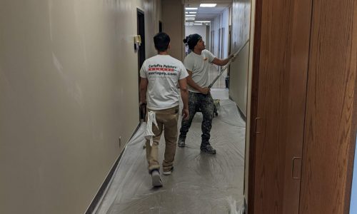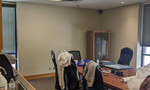This office building and warehouse, located in St. Paul, was in need of an interior makeover. Before we could begin painting, however, our team had to remove the commercial wallpaper that covered the facility. The commercial wallpaper was old and failing on all walls of the facility – hallways, conference rooms, offices and bathrooms. We had to cut around the corner guard protection to keep those intact. This was an occupied space while we were working, so we used a HEPA vacuum attachment to keep dust to a minimum and kept floors clean and clear throughout the project. We sanded all the damage from wallpaper removal and leftover adhesive that was still on the wall.