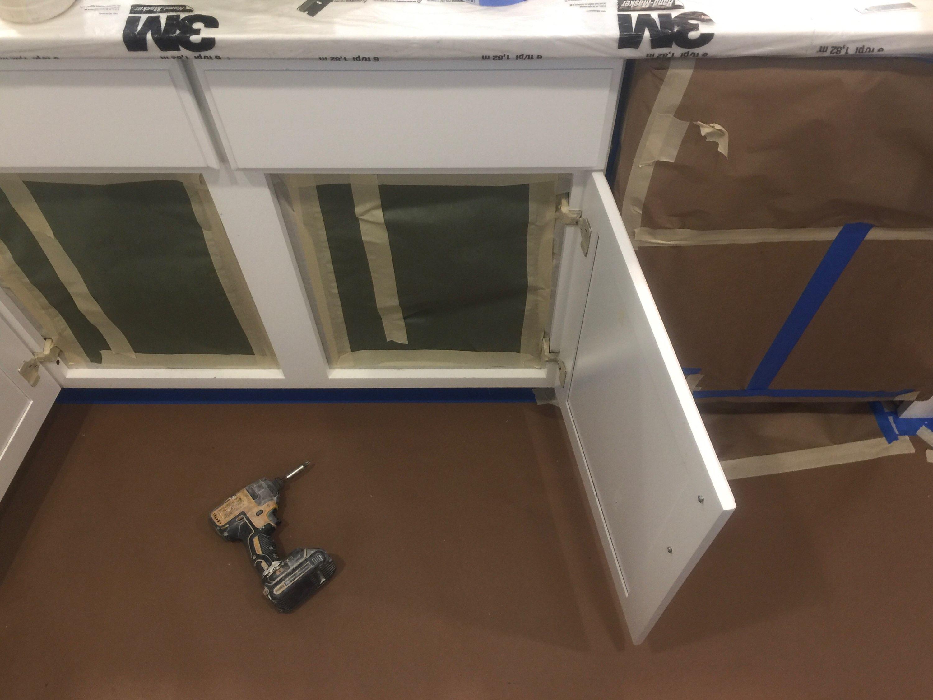 This is a closer look into the cabinet refinishing work. We’ve taped off and we’ve removed what we could from the cabinets.