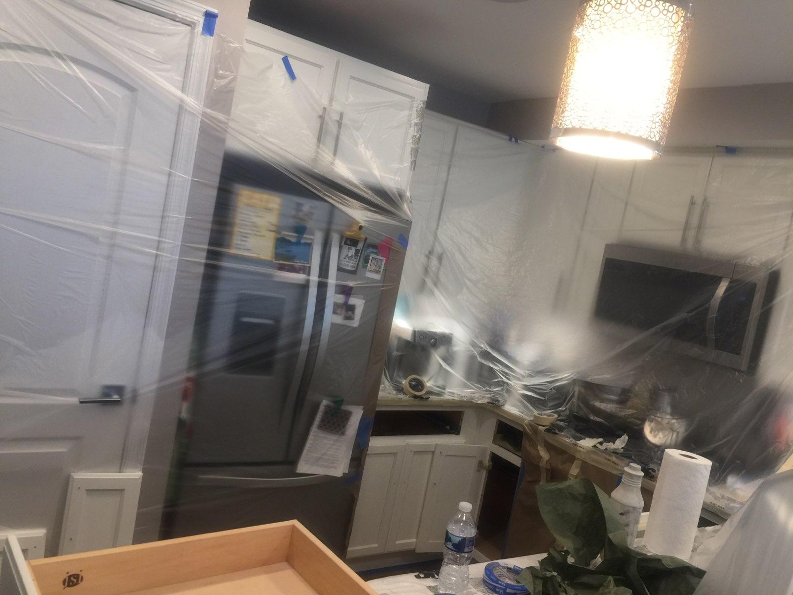 CertaPro Painters® of Washington DC always takes precautions in making sure nothing that we don’t want to be painted gets painted. That’s why you see all of this plastic in the customer’s kitchen. We also started to remove the cabinets to begin the work on them.