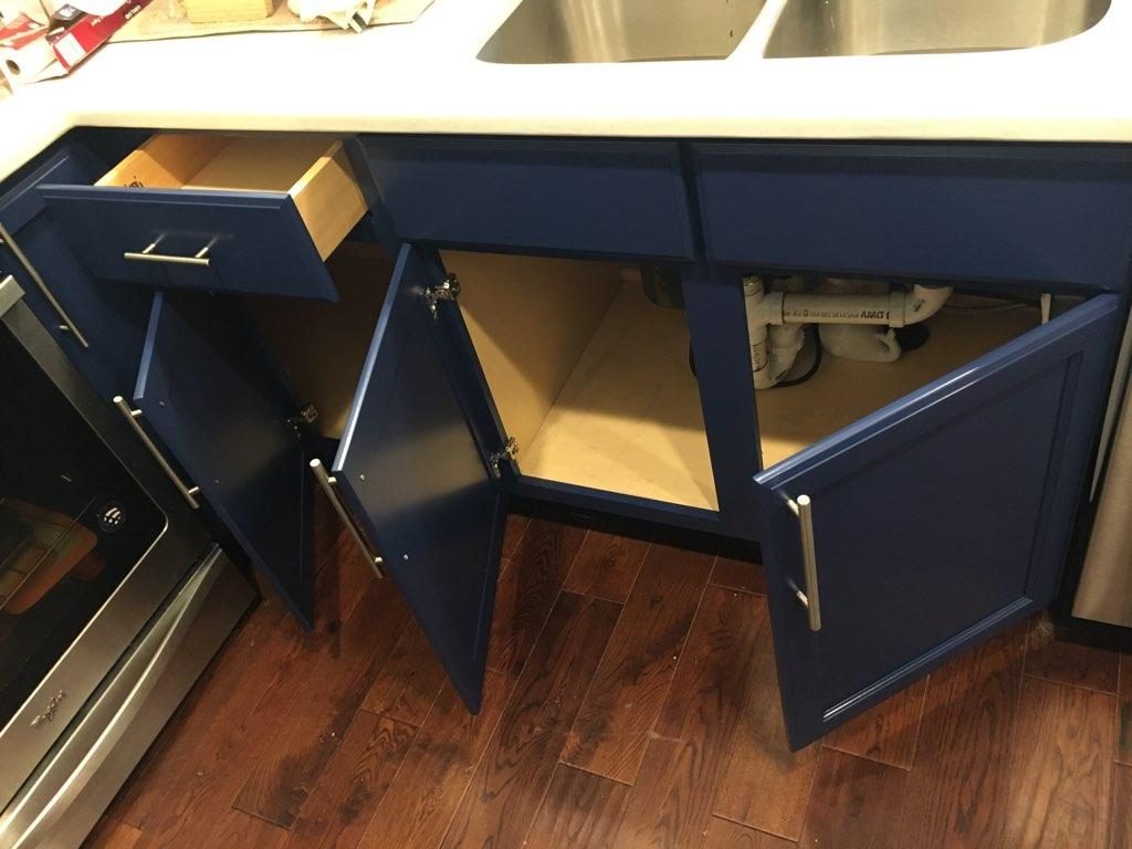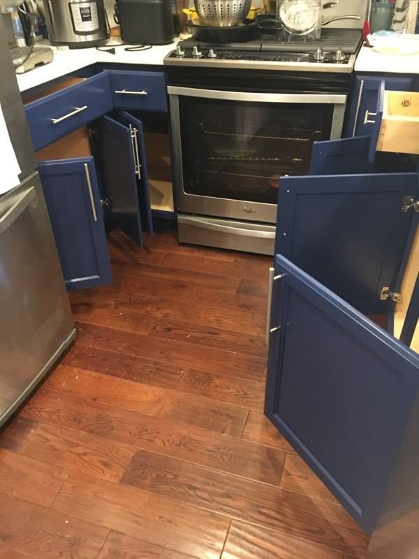 This beautiful cabinet refinishing project only took two days to do with our team of professional painters. Going from light to dark is always exciting because the differences are so drastic. We think it looks so much better in the dark blue color!