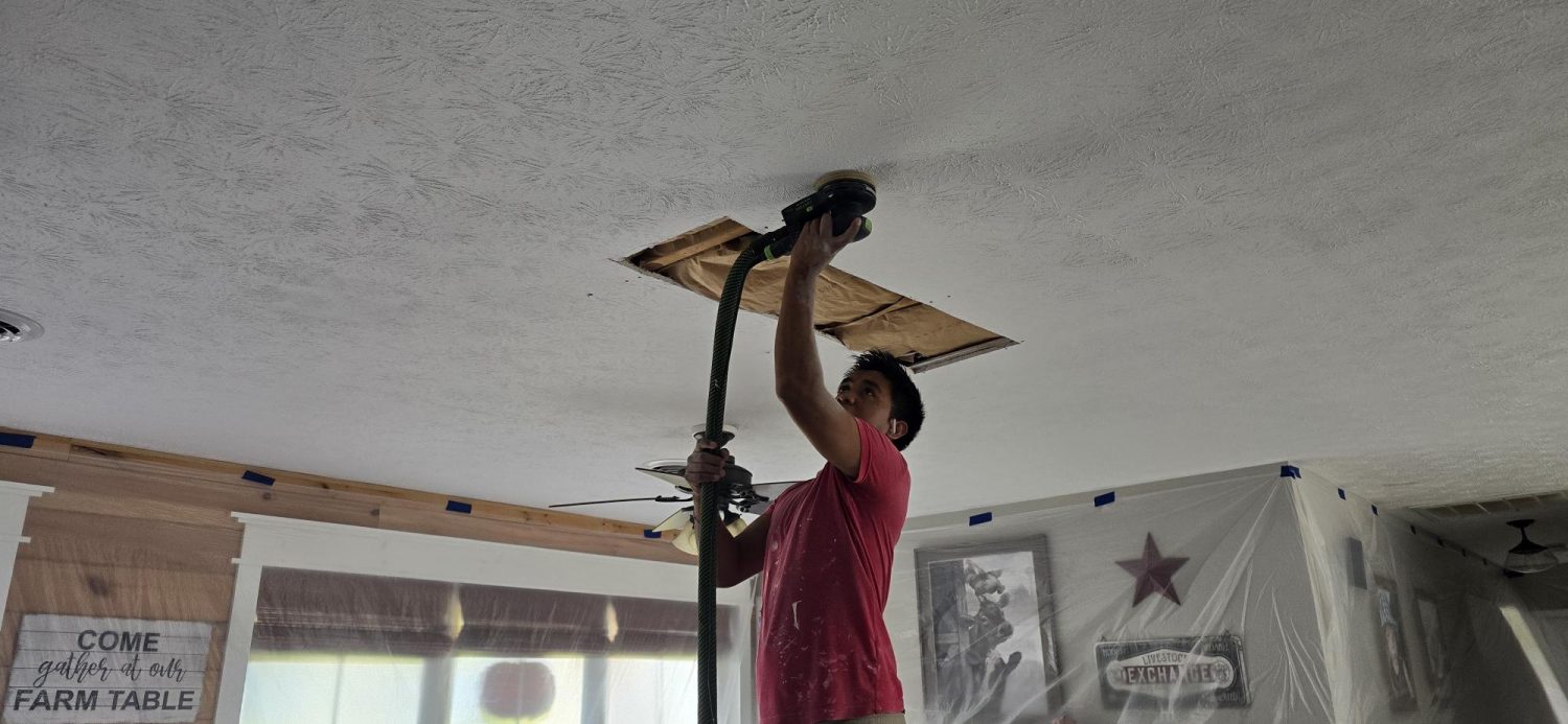 One of the key challenges was cutting a precise opening in the damaged ceiling, replacing the drywall, and retaping seams to ensure a smooth, uniform appearance. Texture matching was crucial to blending the repaired section with the existing ceiling surface, ensuring a cohesive look.