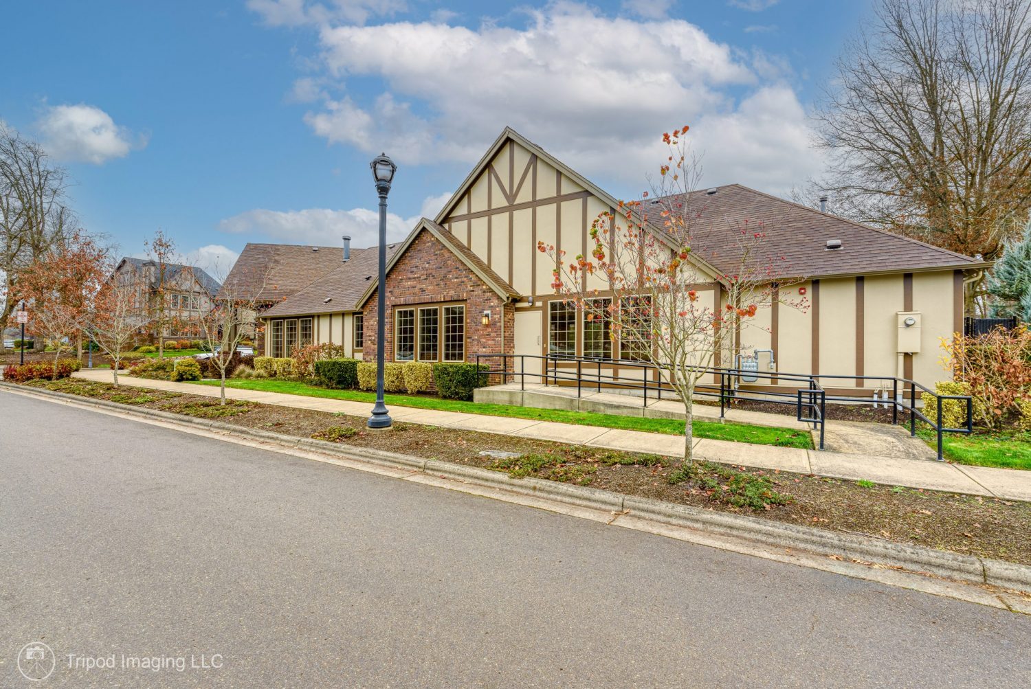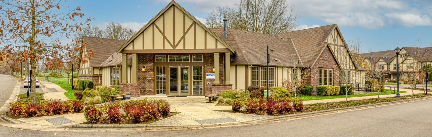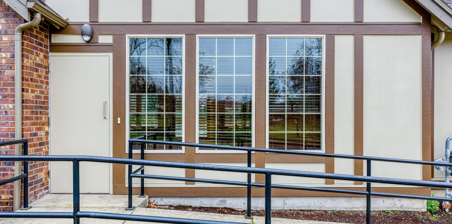 The center was built in 2013 so was in good condition before painting. Some of the exterior doors had some damage at the bottom so kickplates were installed. The double entrance doors in the back and front were originally stained and were very faded from the sun. The community opted to have them painted for a more durable finish. After a thorough power wash, the crew needed to move a large tank away from the building to allow access. There were no needed repairs before painting. The building had one siding color and 2 trim colors.