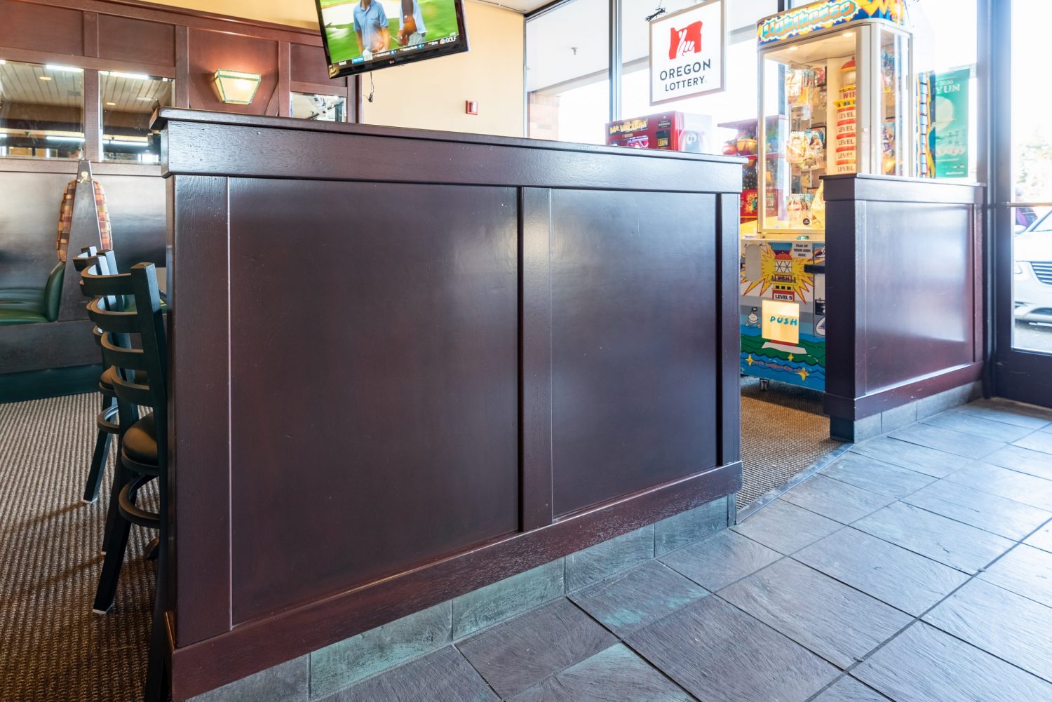 Godfathers Pizza is a popular place for lunch and dinner for many of the Troutdale, Oregon locals. The interior had quite a bit of mahogany stained wainscoting and trim that had seen a lot of wear and tear. We had worked with this owner before and knew the difficulties of not interfering with business. Because the owner was also replacing carpet he decided to close his business from Monday to Friday afternoon. What easily could have taken us a week we needed to finish in 3 days. We sanded, and in some cases stripped off the old stain and re-stained the wood to match perfectly what was there. Then we put a protective coating of urethane over the stain. We patched and painted some of the walls and one ceiling. When all was done we had helped create an inviting environment for pizza lovers.