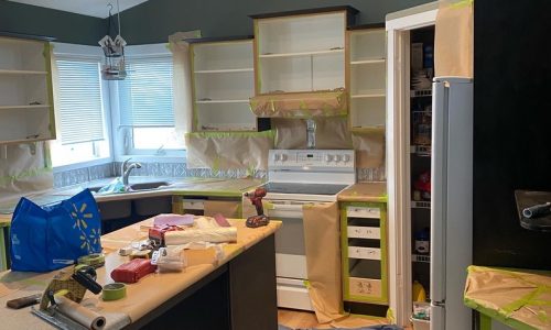 Our team was hired to repaint the kitchen cabinets in a clients home. The cabinets were previously painted brown and had lots of texture from the previous paint job.