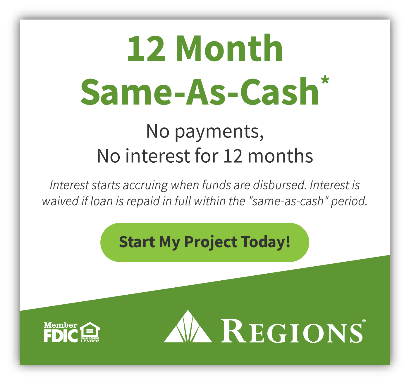 *Credit and loans provided by Regions Bank, Member FDIC, (650 S. Main St., Suite 1000, Salt Lake City, UT 84101) on approved credit, for a limited time. 19.99% fixed APR (provided however, APR will not exceed 15.99% for residents of New Jersey and 17.99% for residents of Florida and Wisconsin), effective as of January 2026, subject to change. Minimum loan amounts apply. Interest starts accruing when funds are disbursed. Interest waived if repaid in 365 days. Repayment terms vary from 24 to 132 months. Actual loan term may be shorter if less than the full approved amount of credit is used. First monthly loan payment due 365 days after funds are disbursed. If no payments made during same-as-cash period and APR of 19.99%, monthly payments vary from $21.99 to $30.82 per $1,000 borrowed depending on term. The minimum monthly payment will be no less than $50.00.