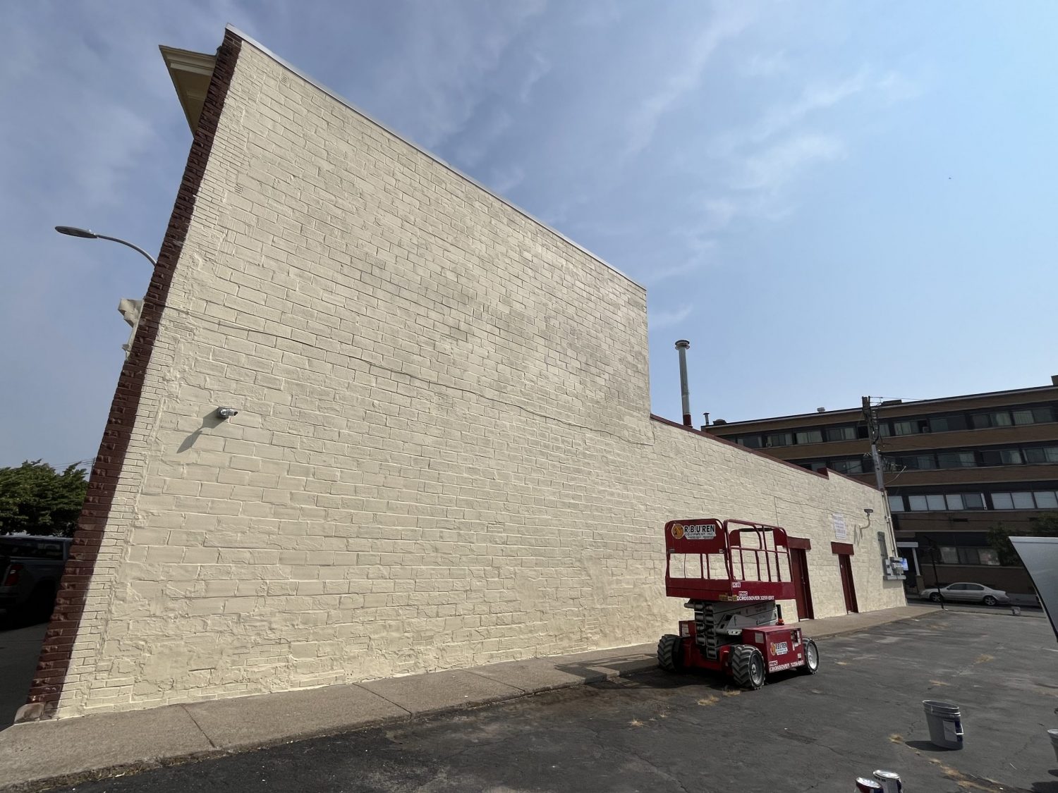 Advanced masking techniques were critical to protecting surrounding surfaces. Painter’s plastic, tape, and protective paper were used extensively to prevent overspray on adjacent businesses, signage, and unpainted brick.