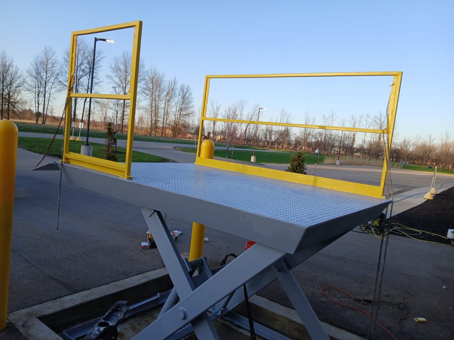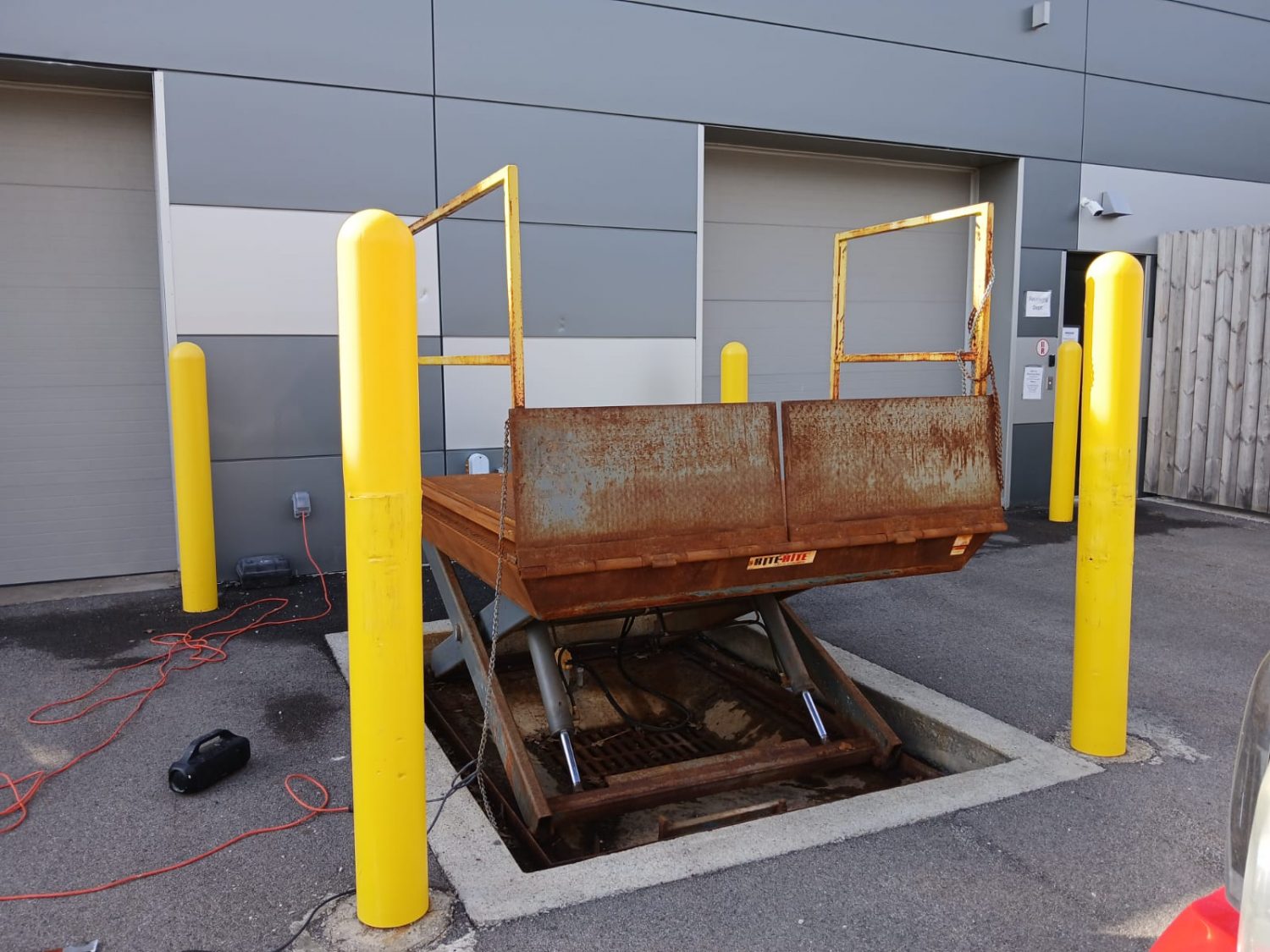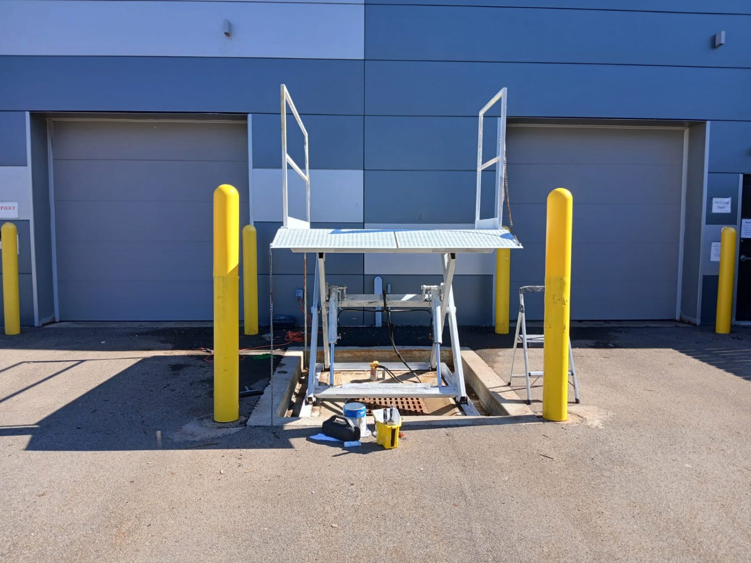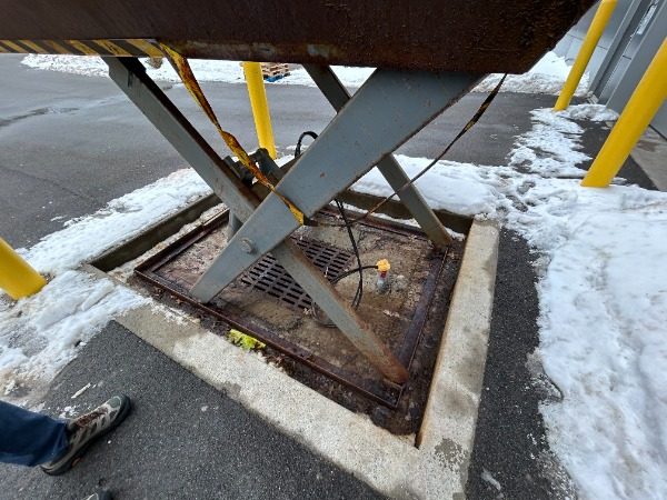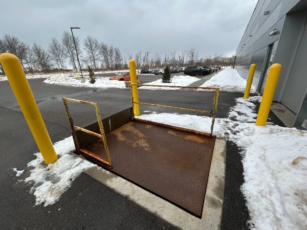 The project focused on restoring multiple metal components of the pallet lift, including the railings, metal deck, underside extension arms, ground border framing, and folding ramps.
