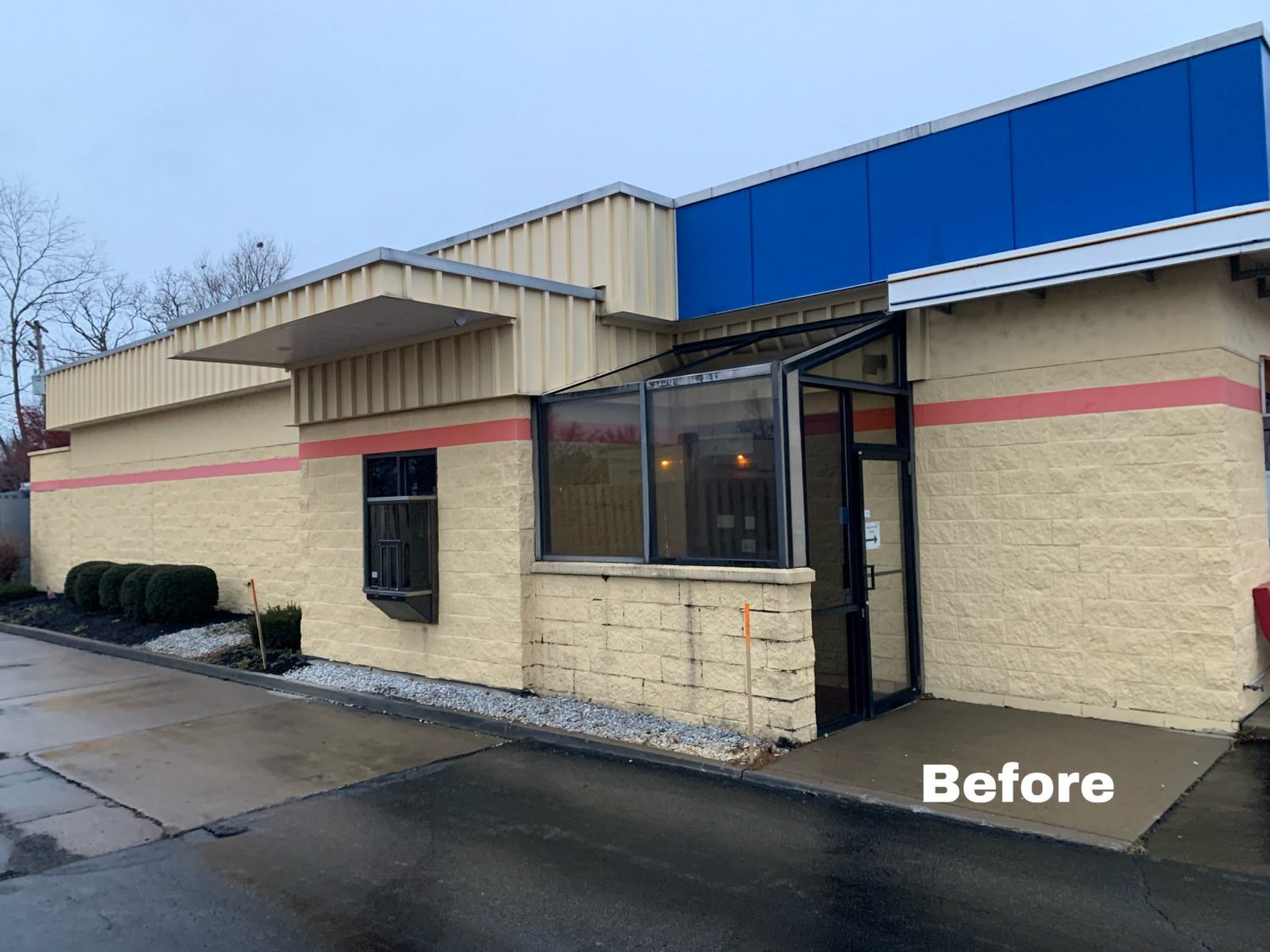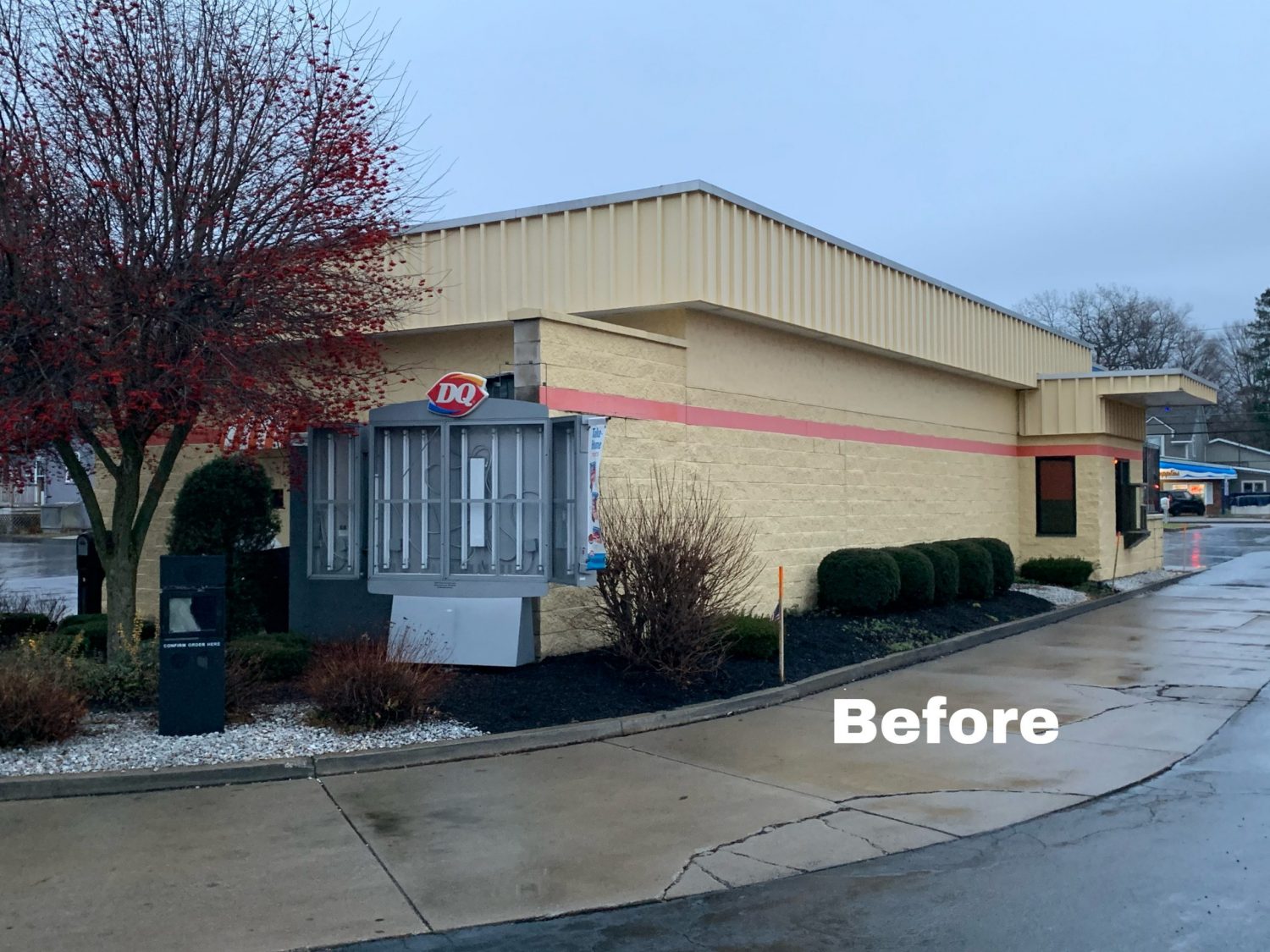 This particular Dairy Queen was due for a significant facelift to attract more customers and align with the modernized brand image. The original building’s tannish-brown color scheme had become dated, and the red accent stripe had faded into a less impactful pinkish hue. Our task was to revitalize the exterior with a new color palette that would stand out and compliment the company’s broader redesign efforts.