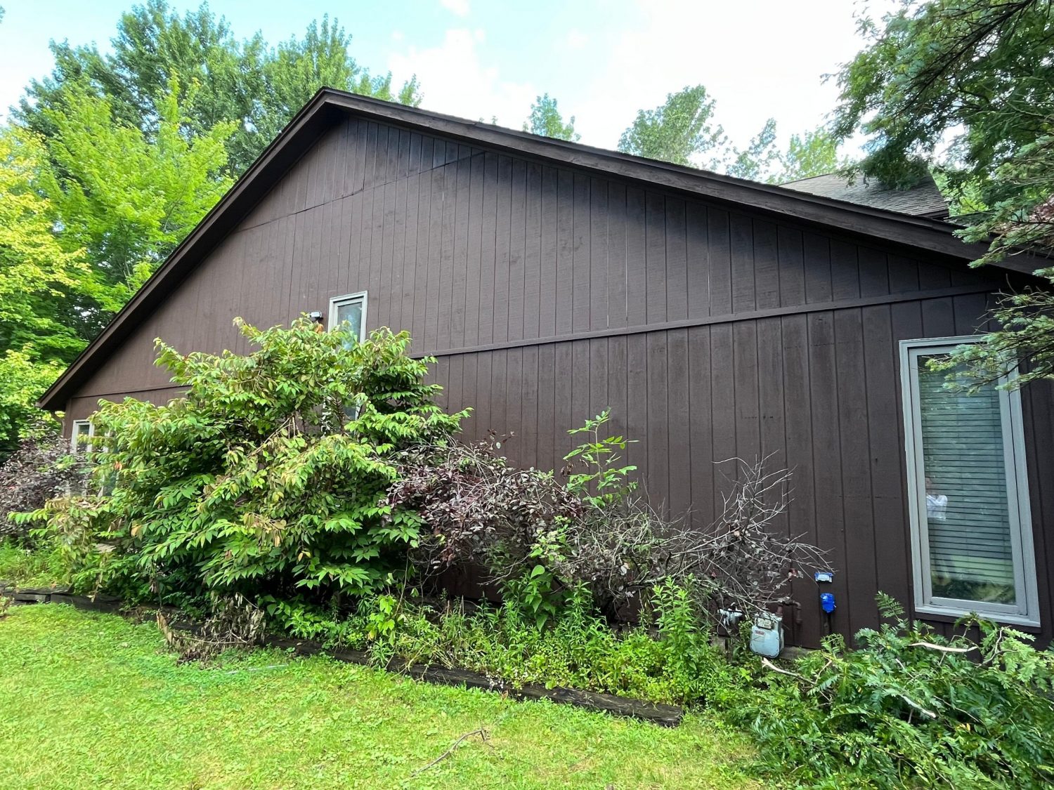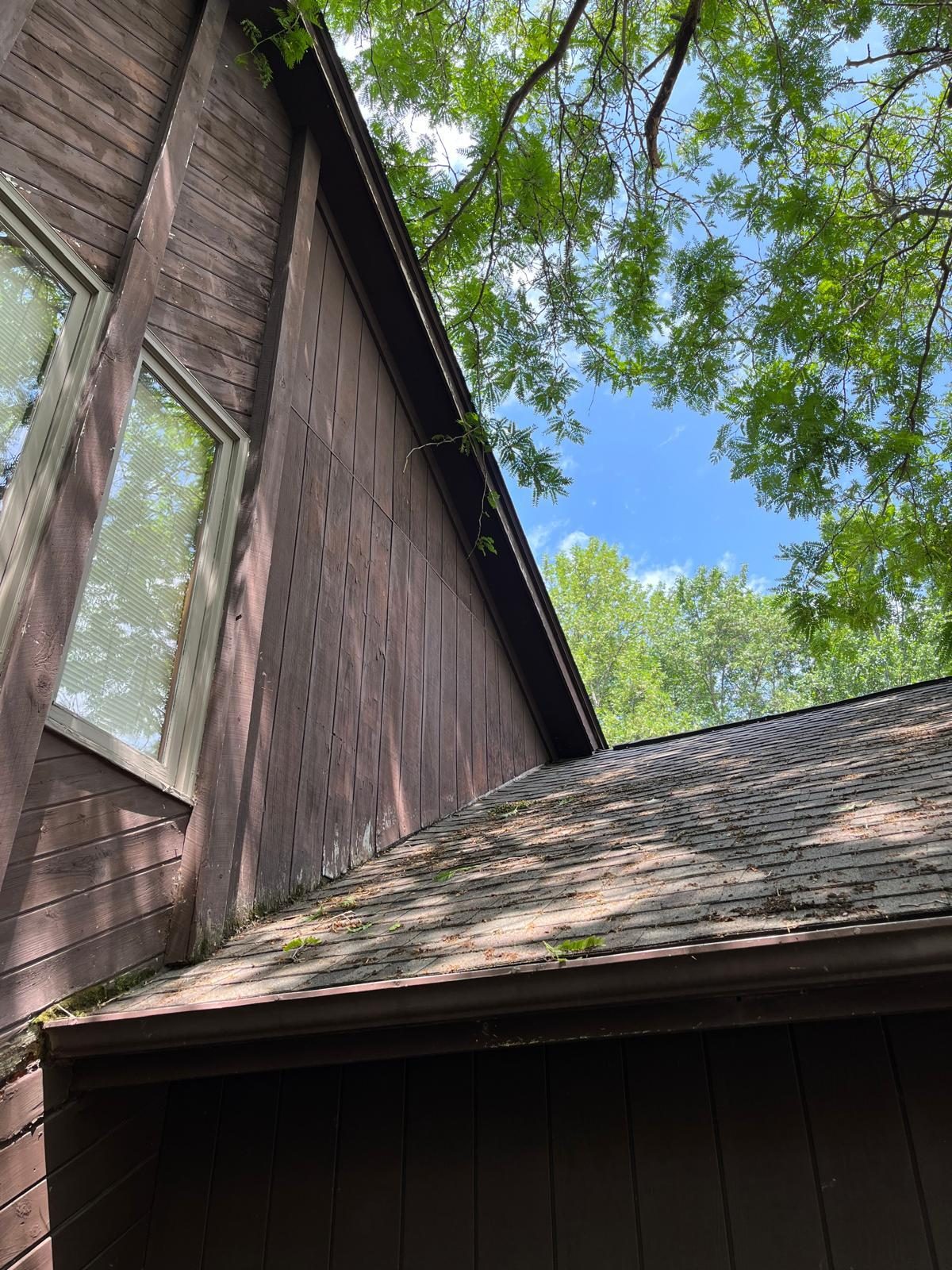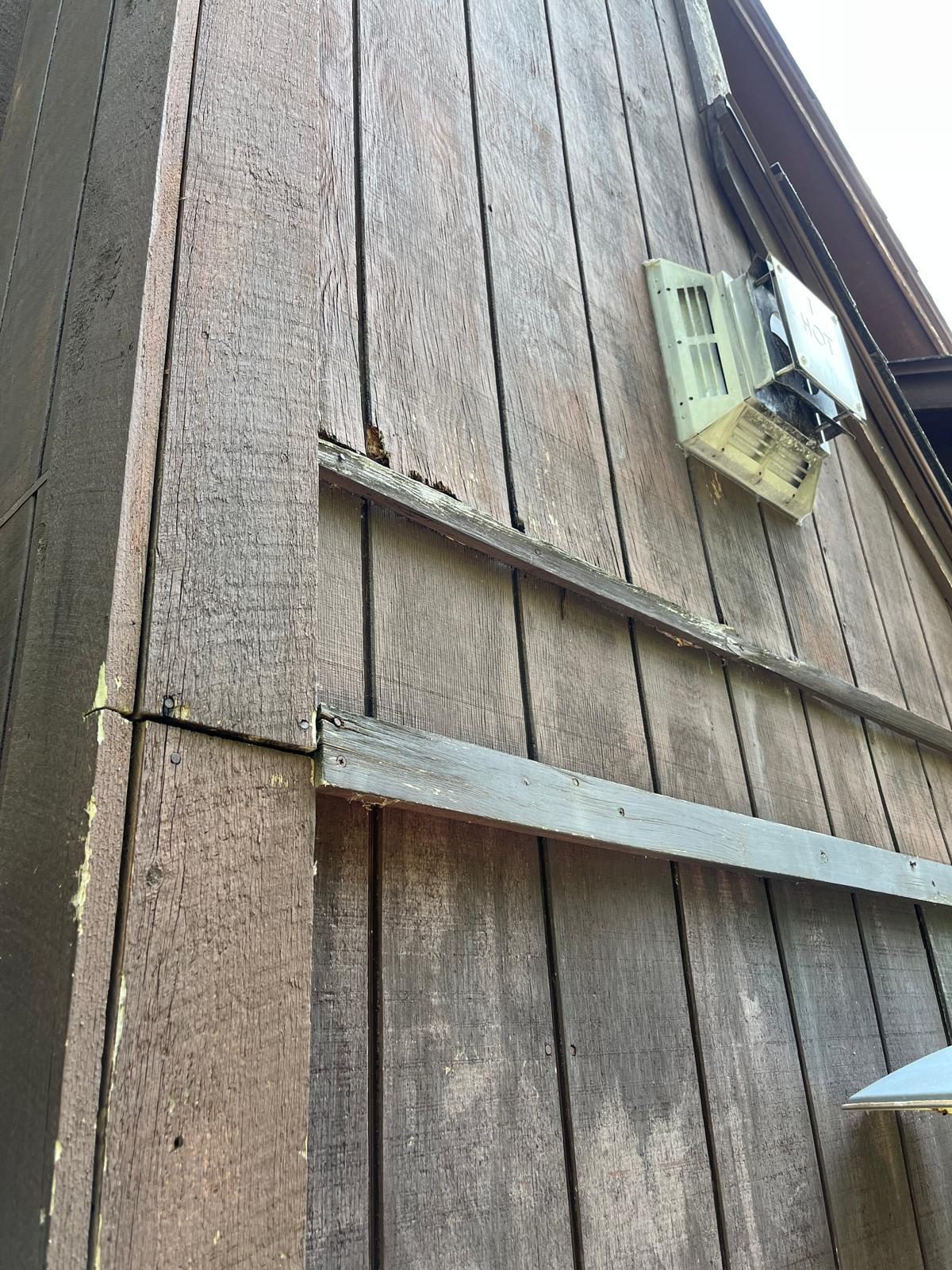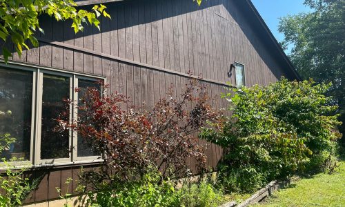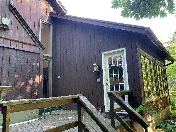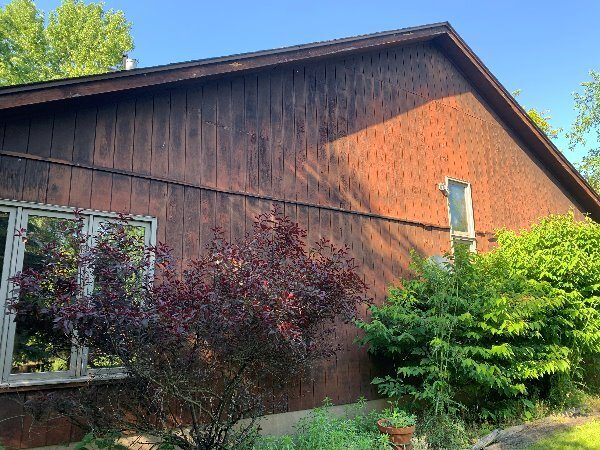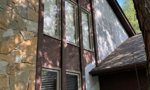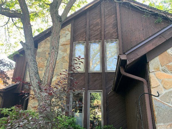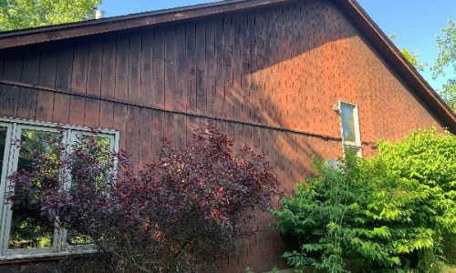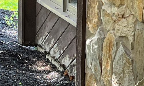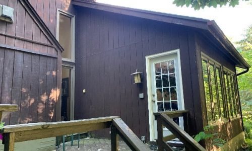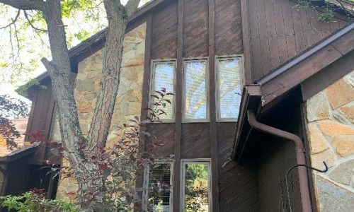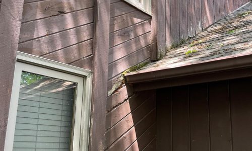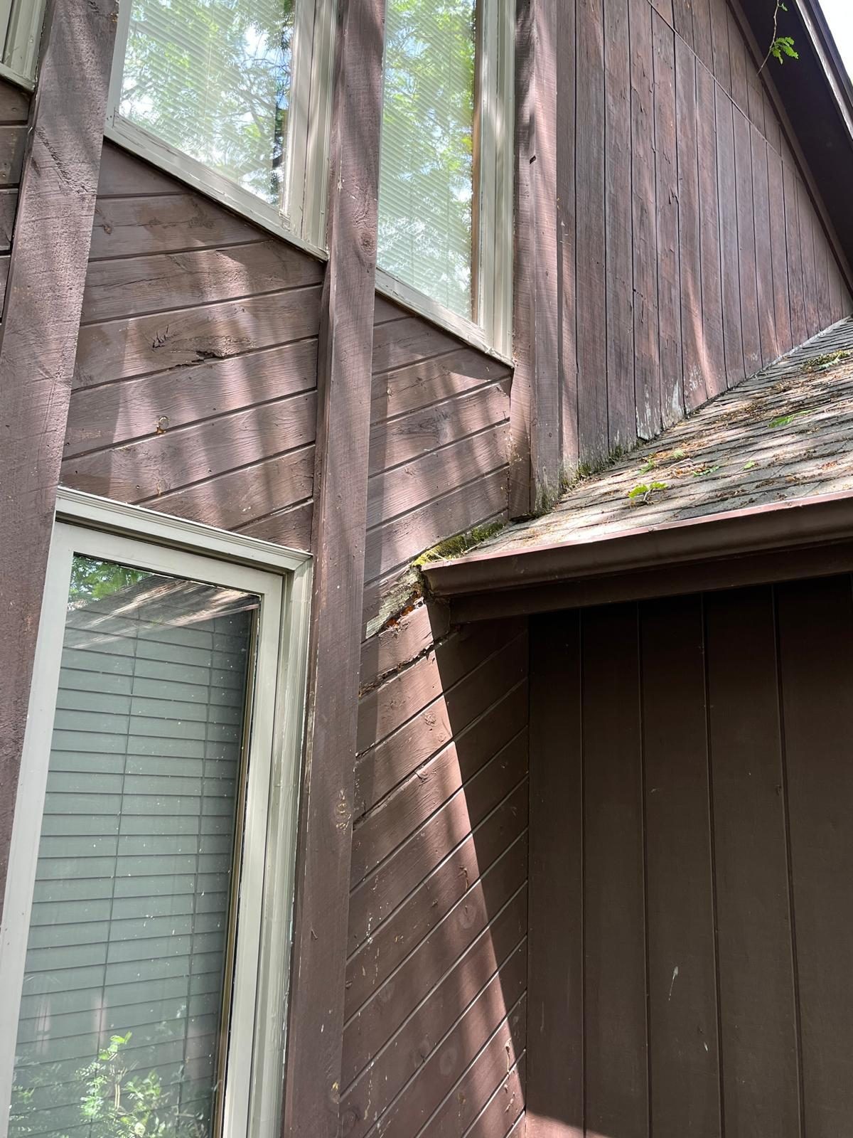 The exterior wood siding had faded significantly over time, with grime and mildew buildup present across multiple surfaces. Areas of the home, including the siding, soffits, and fascia, had sustained damage from carpenter bees and woodpeckers. In addition, several windows and window sashes had begun to deteriorate, requiring attention before painting could begin.