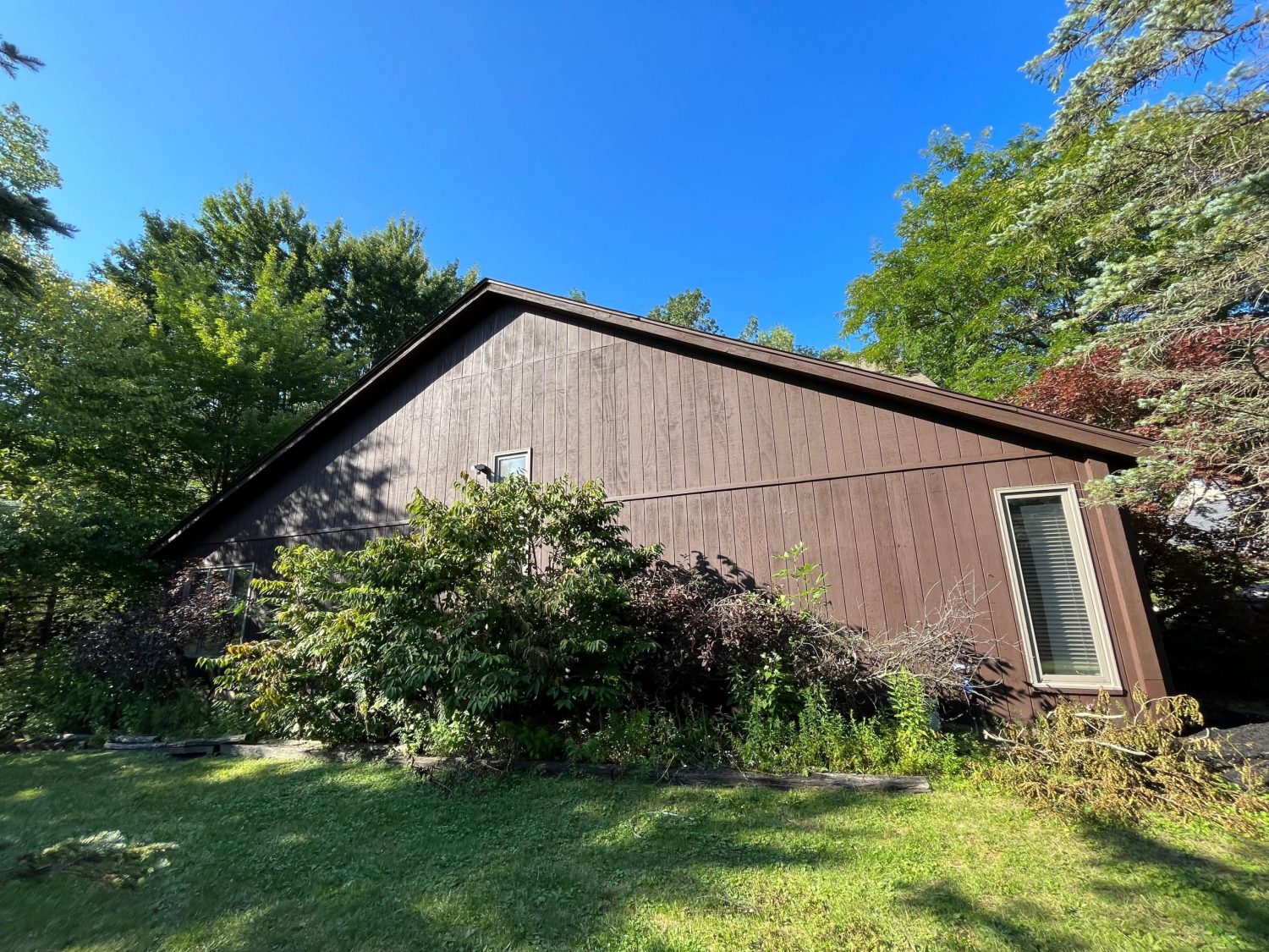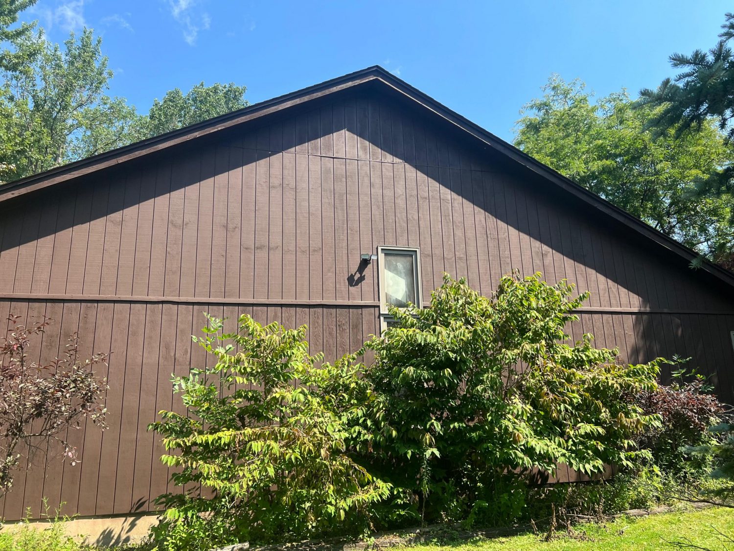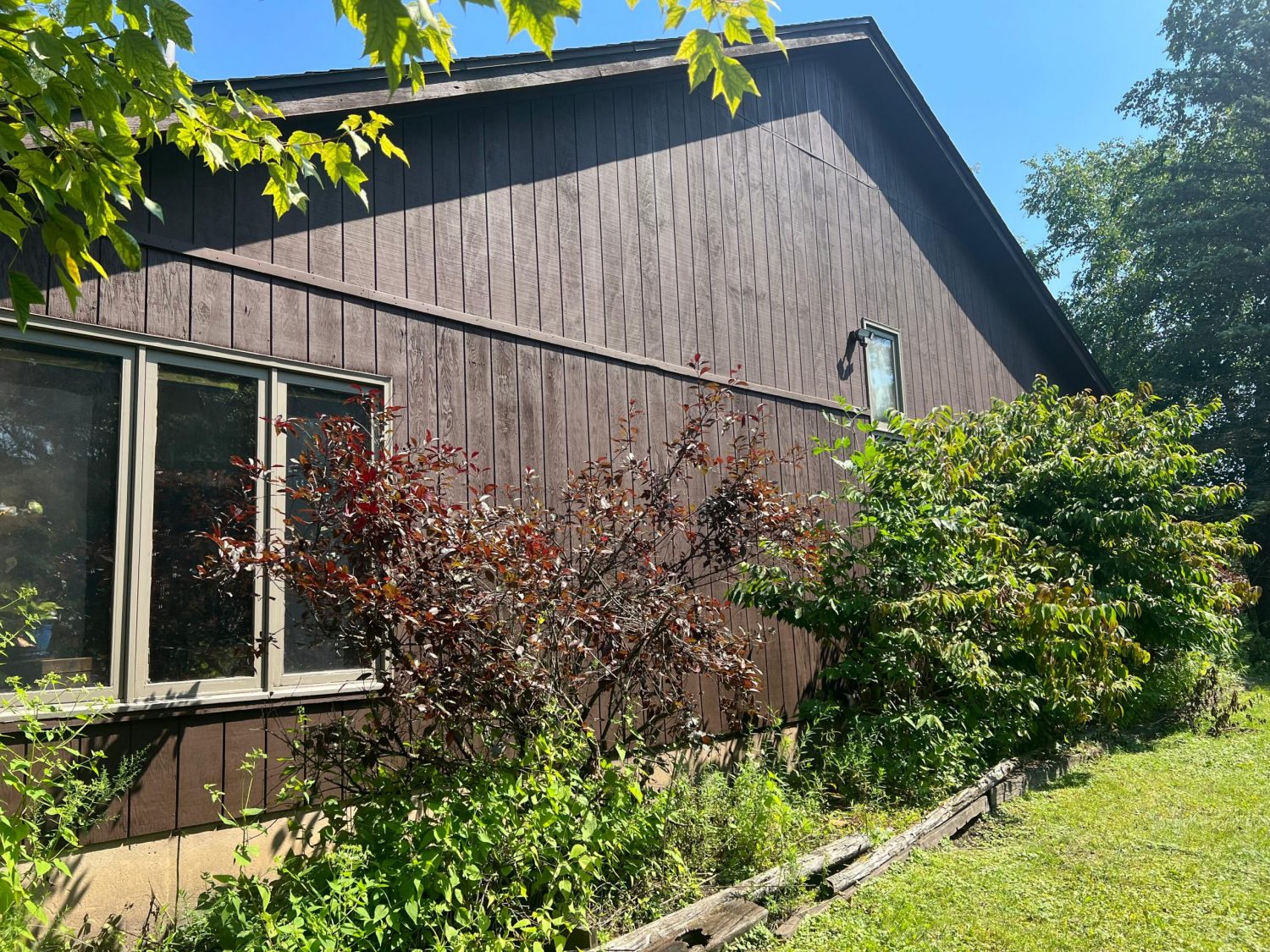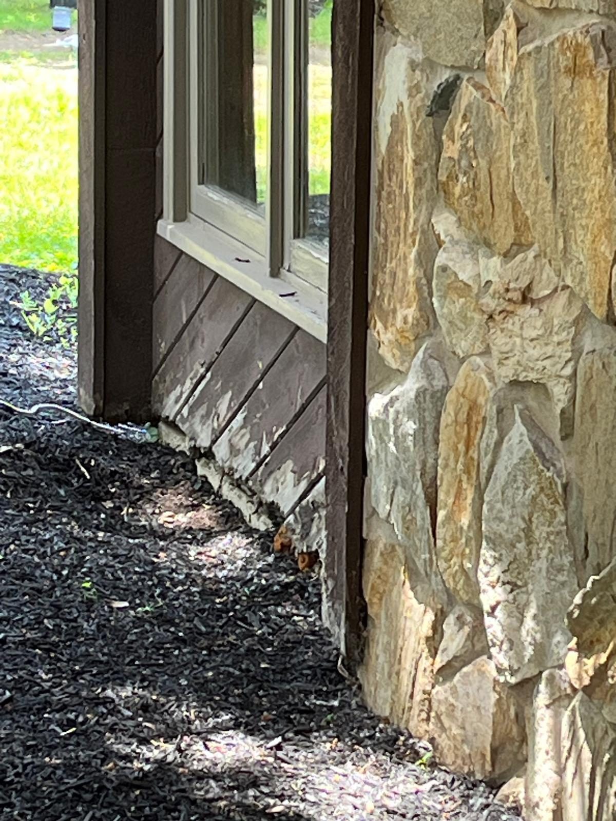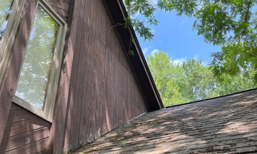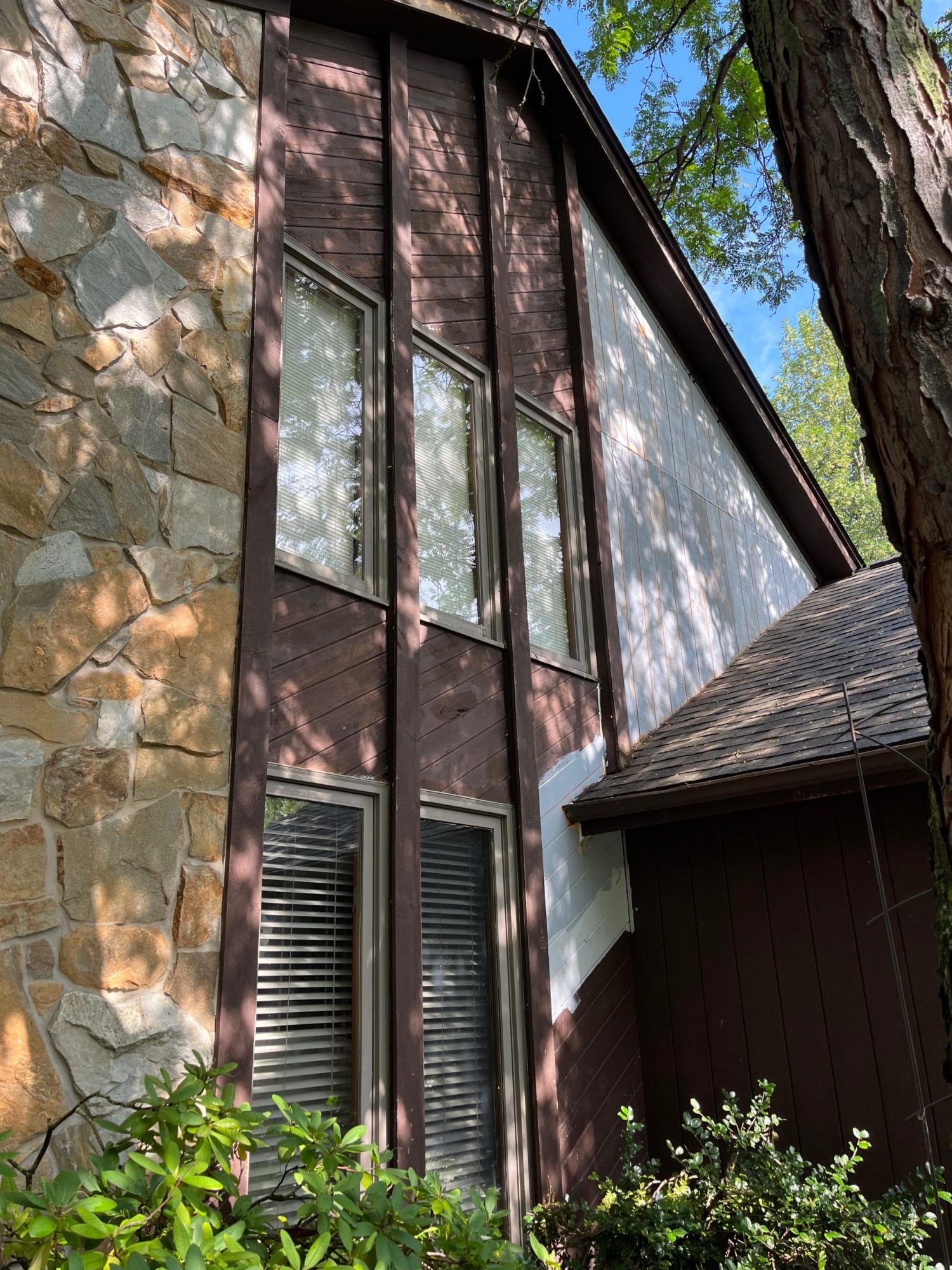 The exterior wood siding had faded significantly over time, with grime and mildew buildup present across multiple surfaces. Areas of the home, including the siding, soffits, and fascia, had sustained damage from carpenter bees and woodpeckers. In addition, several windows and window sashes had begun to deteriorate, requiring attention before painting could begin.