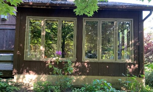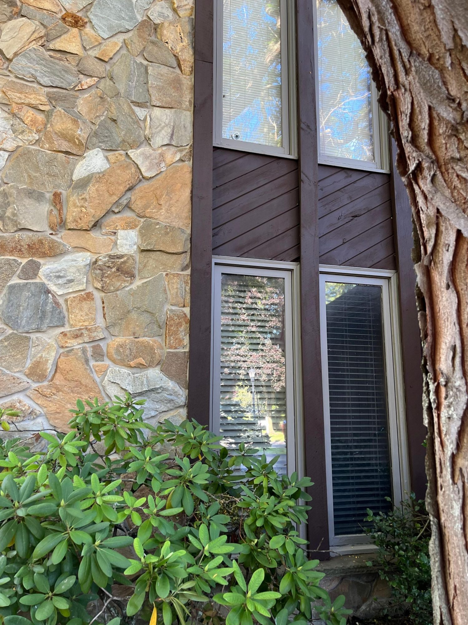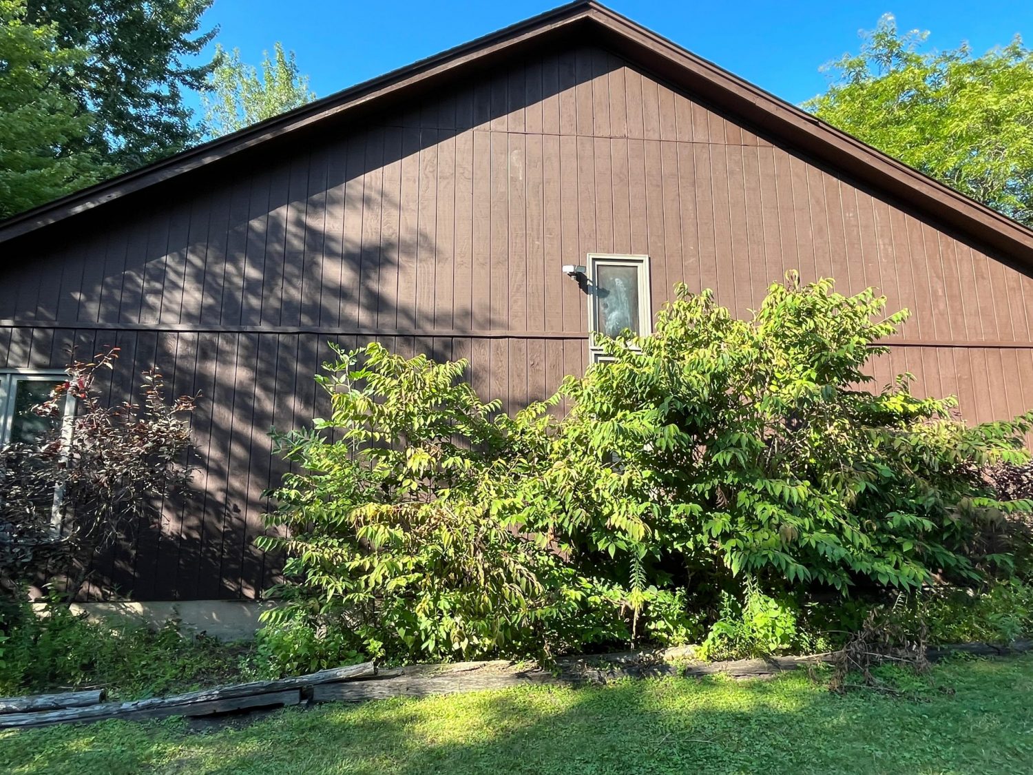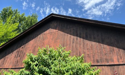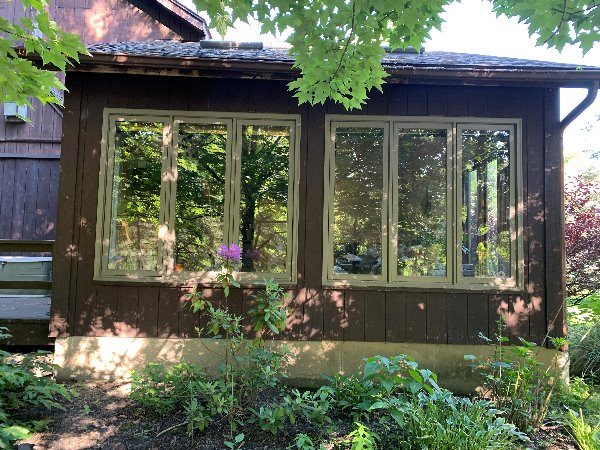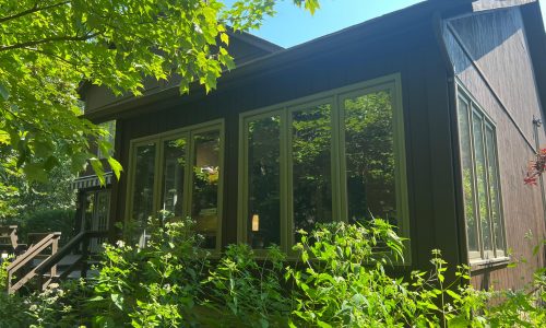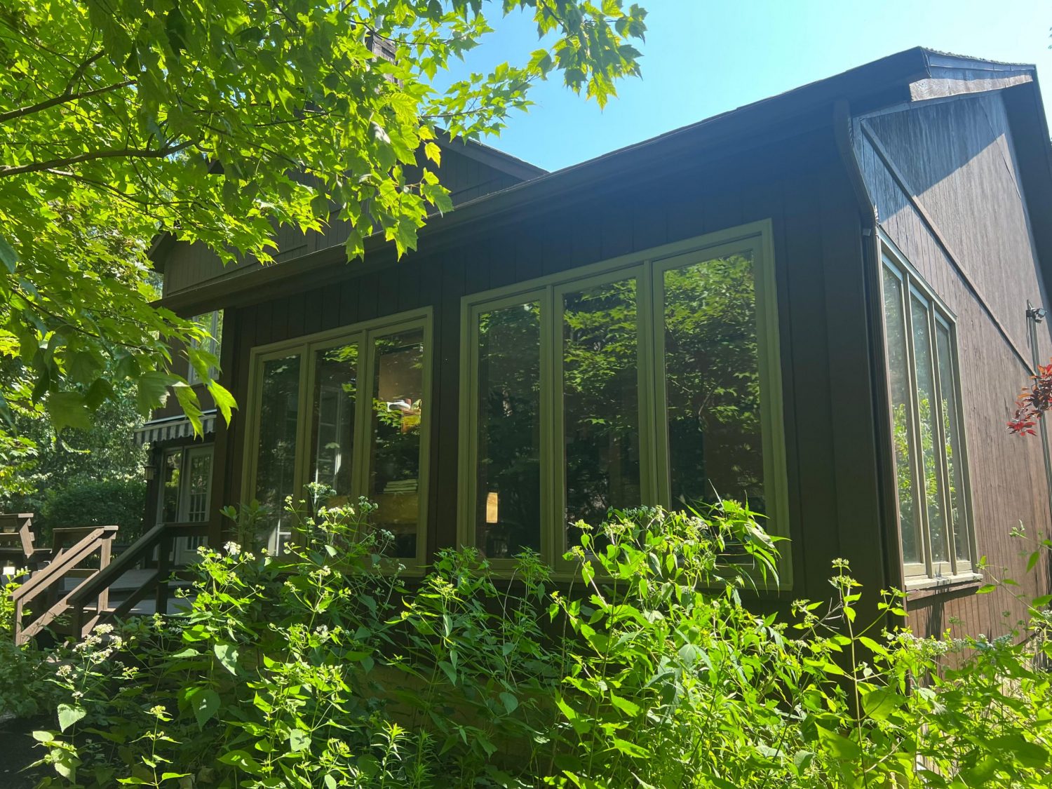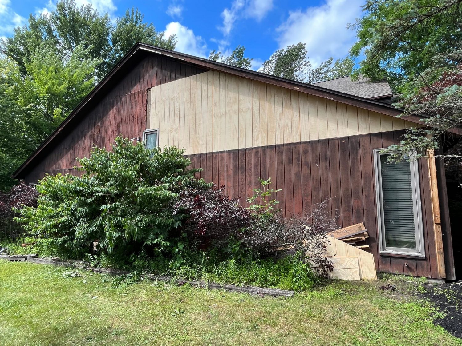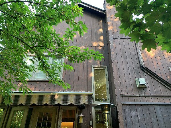 The exterior wood siding had faded significantly over time, with grime and mildew buildup present across multiple surfaces. Areas of the home, including the siding, soffits, and fascia, had sustained damage from carpenter bees and woodpeckers. In addition, several windows and window sashes had begun to deteriorate, requiring attention before painting could begin.