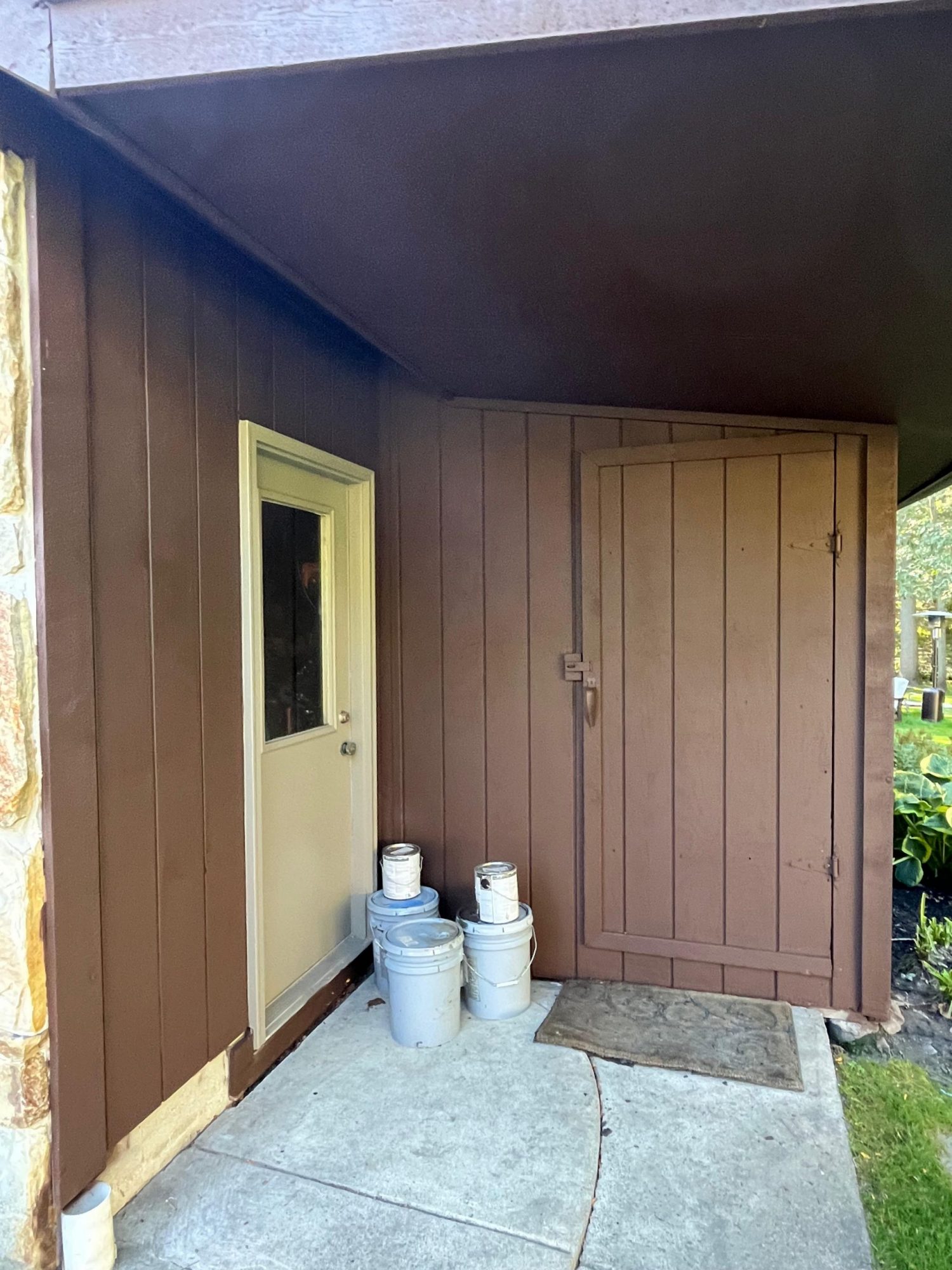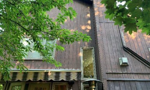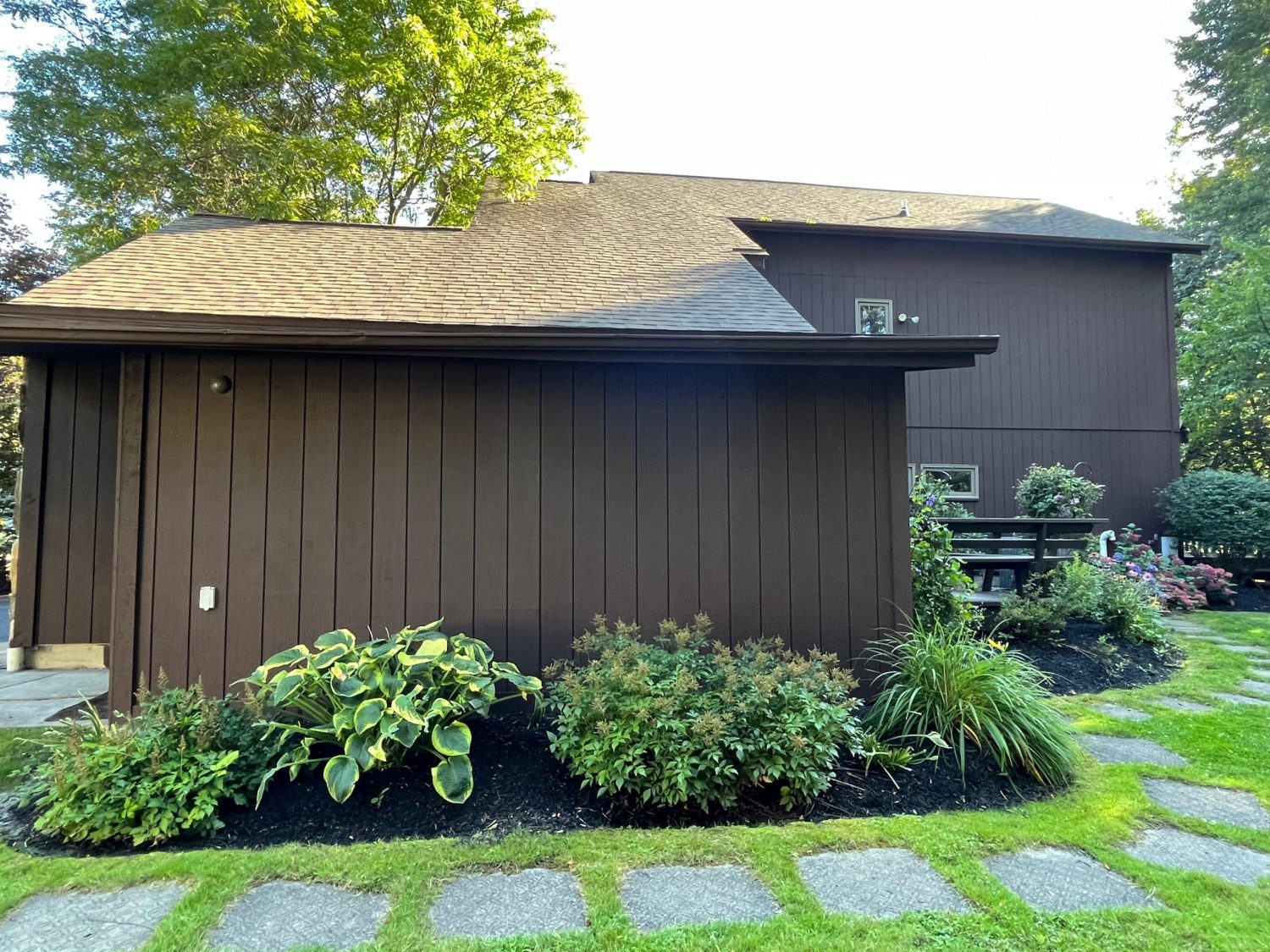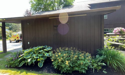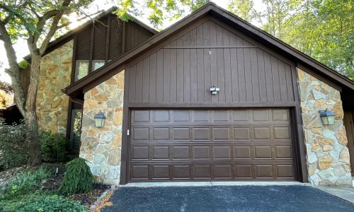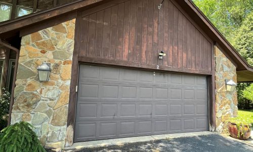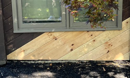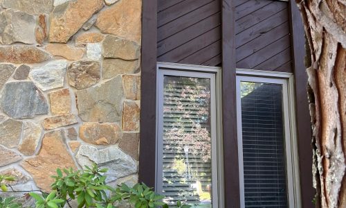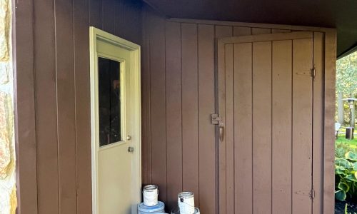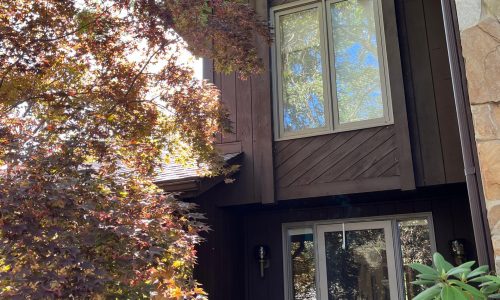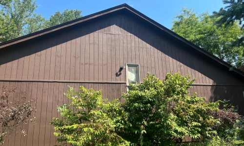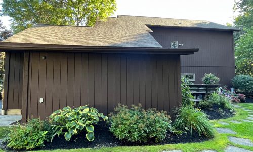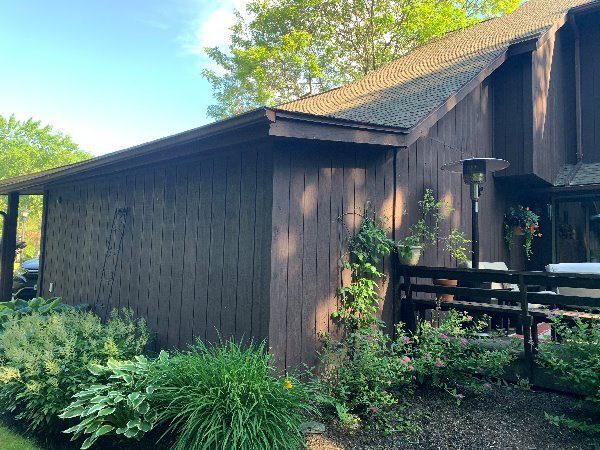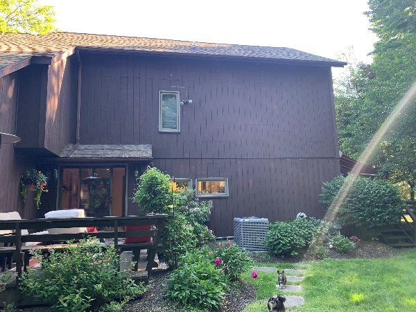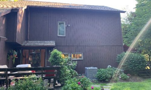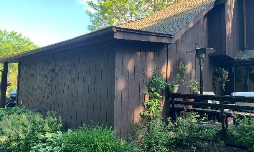 This was a full exterior project that included T1 11 siding, soffits, fascia, windows and window frames, door frames, garage door and frame, and rear deck structures. Additional areas such as deck spindles, steps, benches, and handrails were also addressed as part of the restoration.