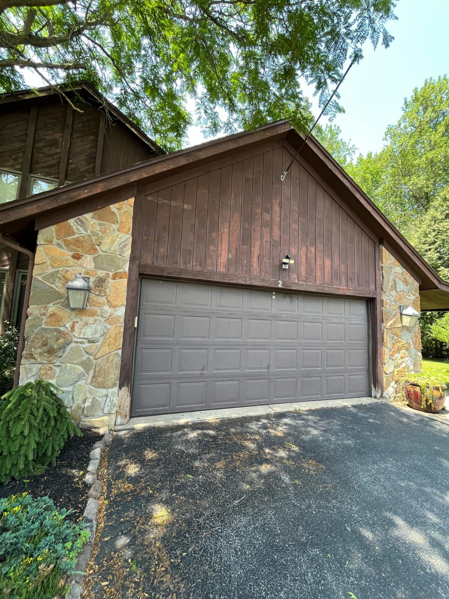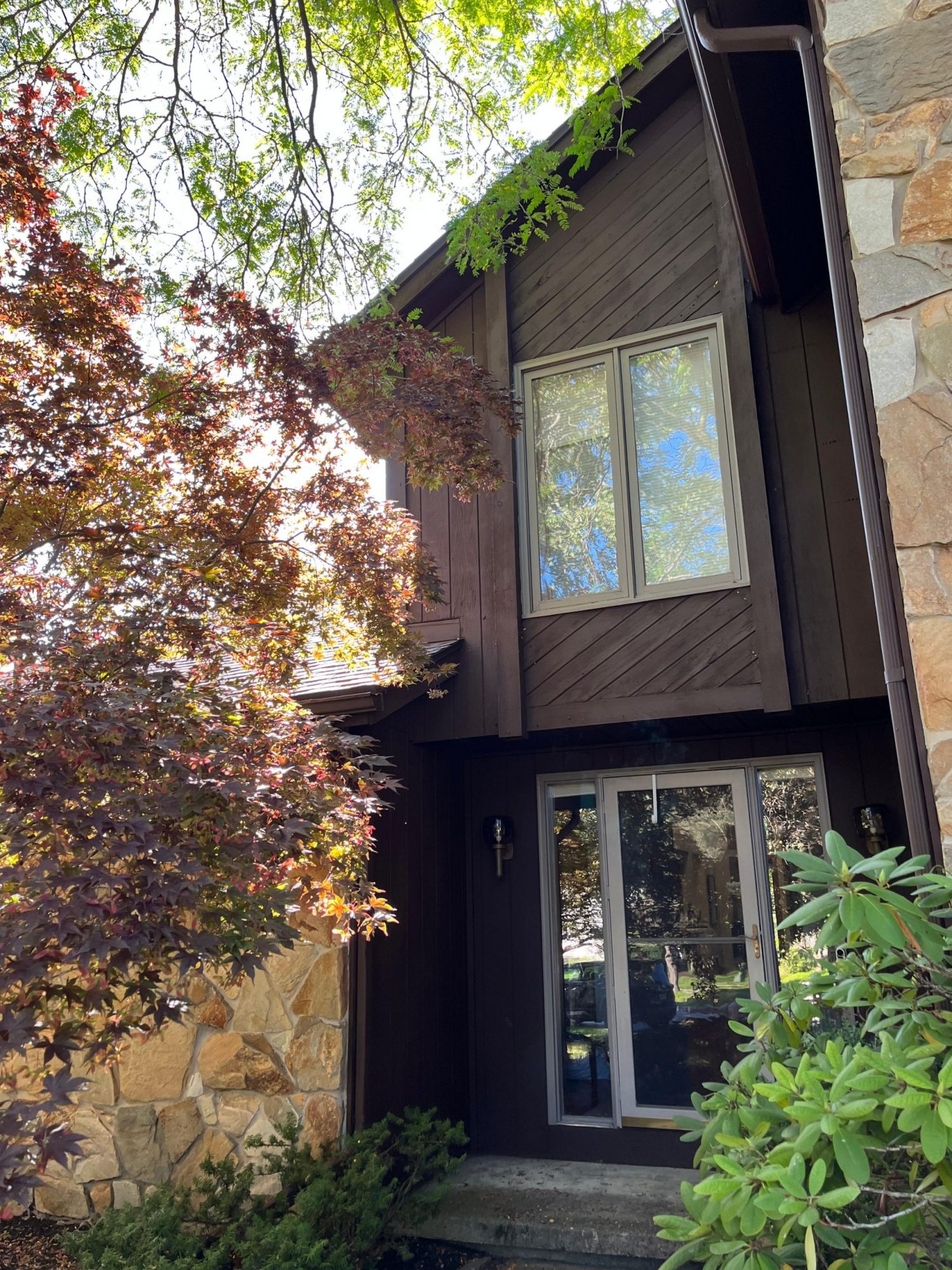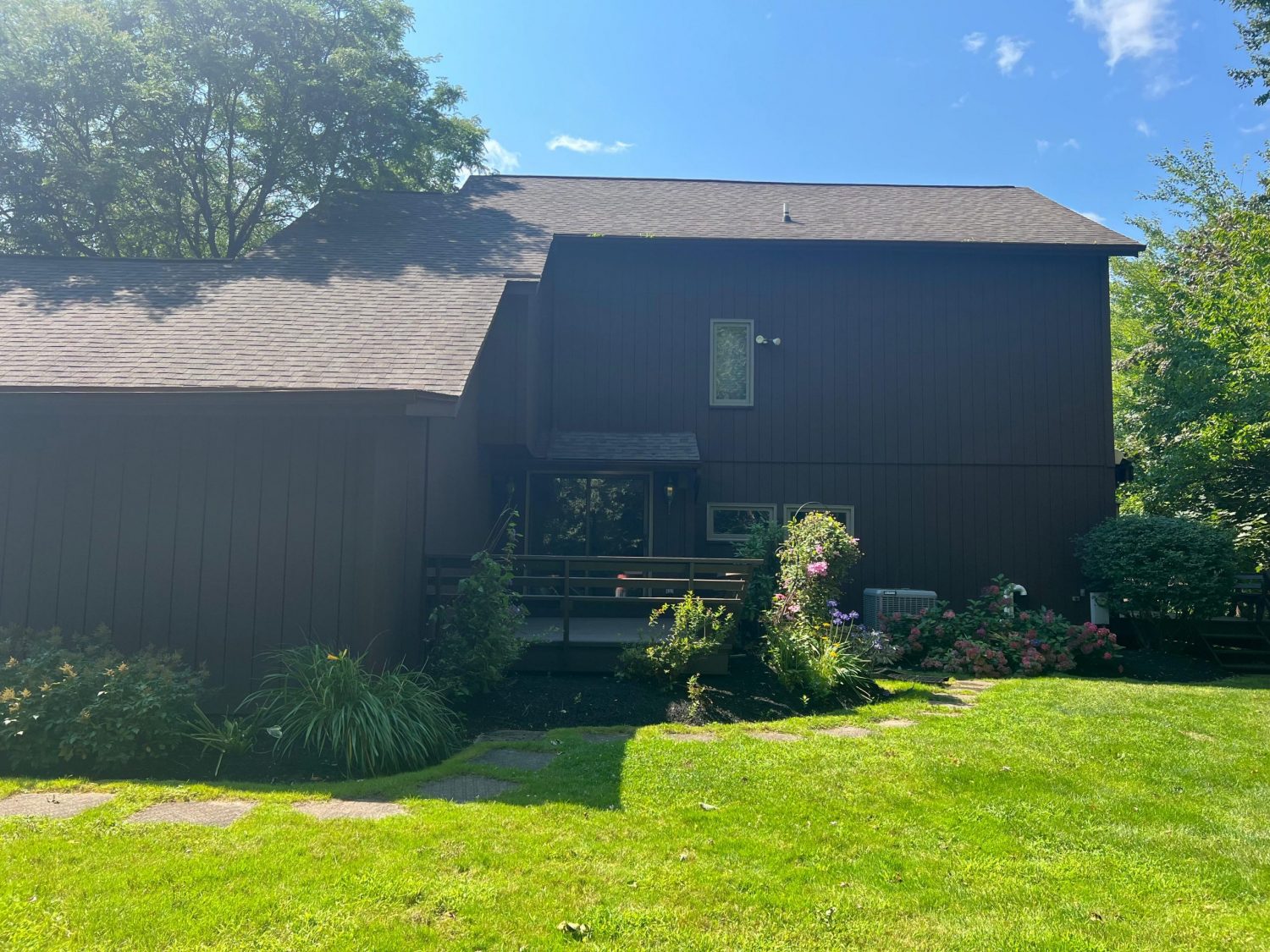 This was a full exterior project that included T1 11 siding, soffits, fascia, windows and window frames, door frames, garage door and frame, and rear deck structures. Additional areas such as deck spindles, steps, benches, and handrails were also addressed as part of the restoration.