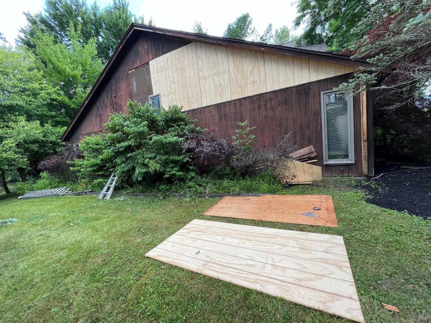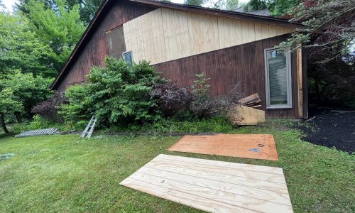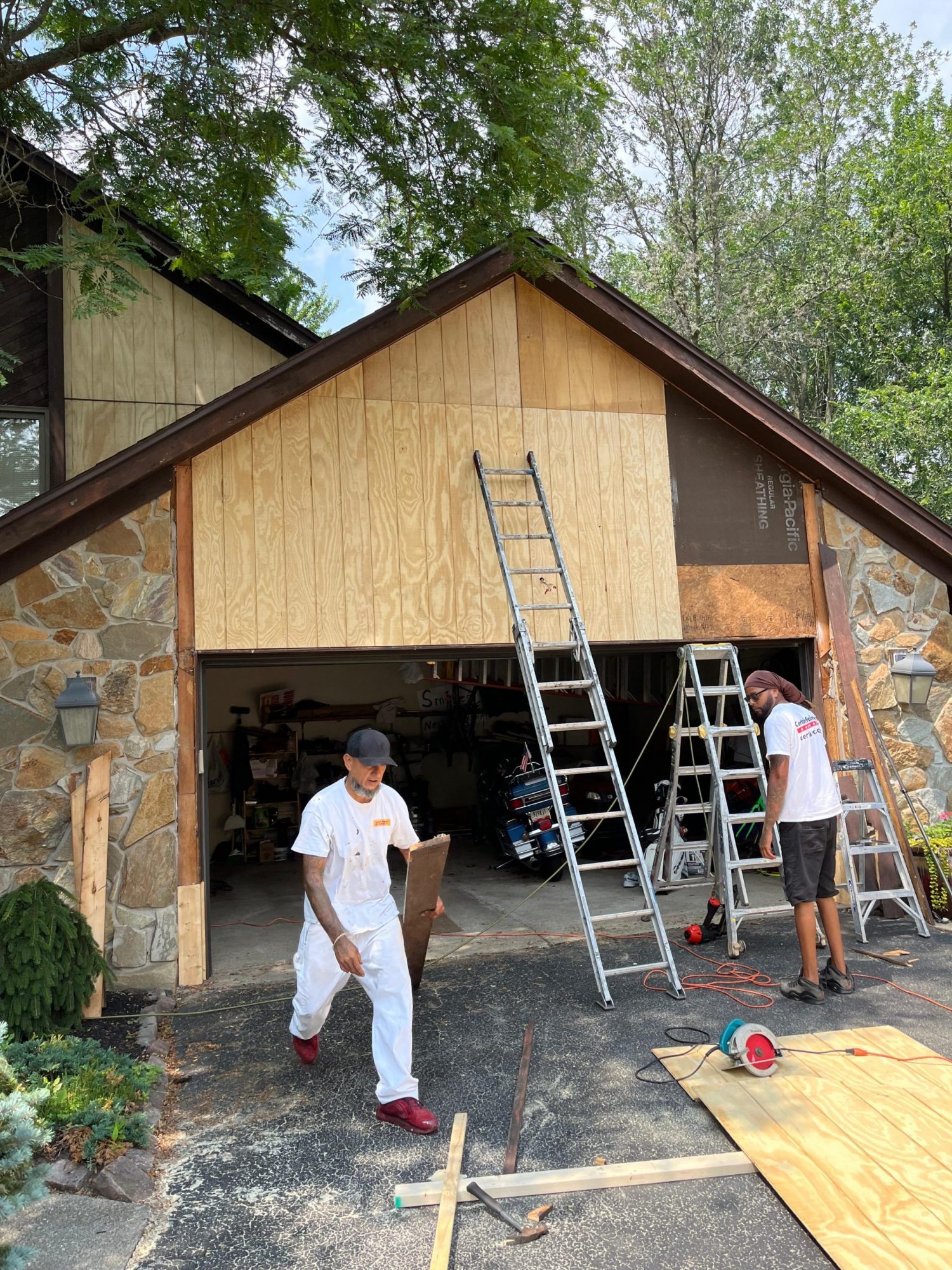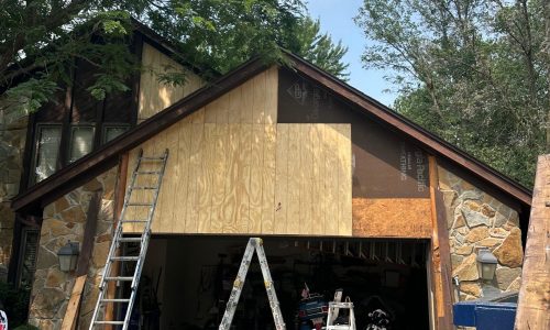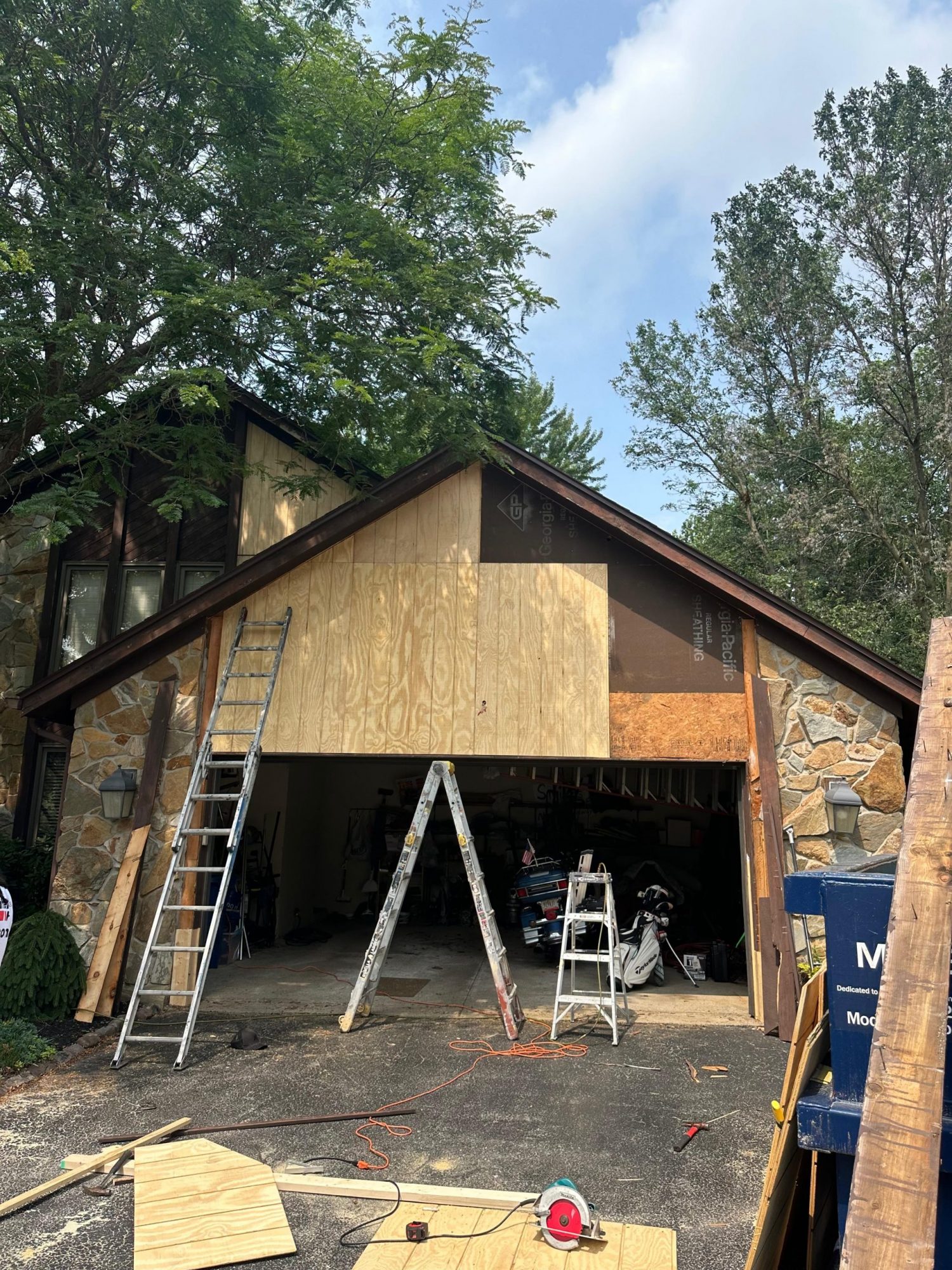 Due to the height and layout of the home, the crew utilized specialized ladder systems to safely access multiple elevated areas. A dumpster was also used on site to manage and dispose of damaged wood and debris from the carpentry work.