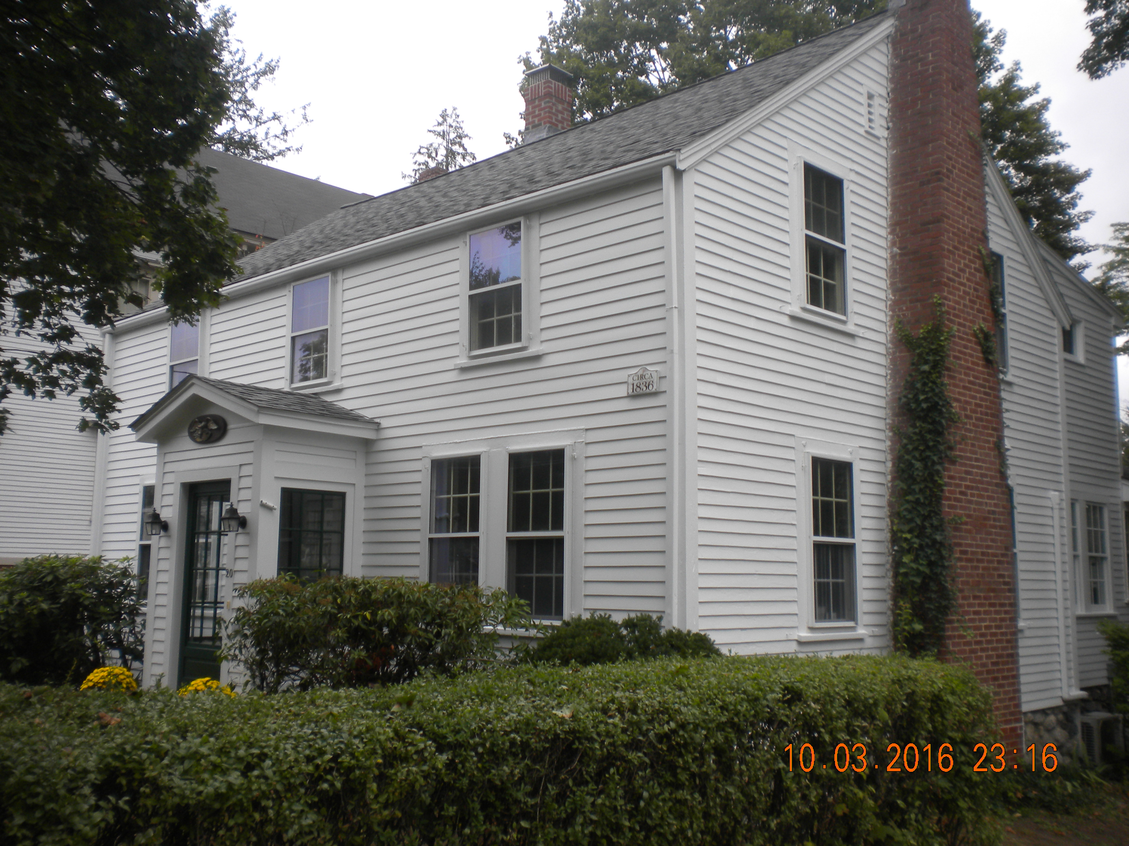 Exterior painting by CertaPro house painters in Woburn, MA – White siding and red brick chimney home