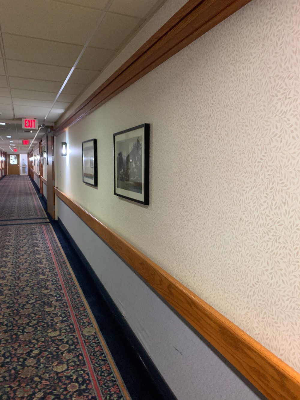 Our team was contracted in November 2022 to paint the 1st Floor Vestibule, Lobby, and the 300-foot long Main Corridor as part of a renovation project. The project involved removing over 5,000 square feet of 30-year-old wallcoverings, wall prep, then painting all walls to match the existing floor coverings. All resident door frames were painted with a fresh coat of paint to complete the look.
