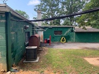 The project started in Fall 2021. The building was first pressure washed to remove all old paint and debris. Due to the fact the building had old, rusted metal windows, they needed to be scraped, caulked, primed, then coated with a urethane alkyd paint. There were also areas of new CMU block that had never be painted. These areas were primed with a masonry primer, then a topcoat of a high-grade Sherwin Williams Masonry Coating was applied. The underside of the porch ceiling was prepped and sprayed to match the wall color and the posts were painted to match the window color.