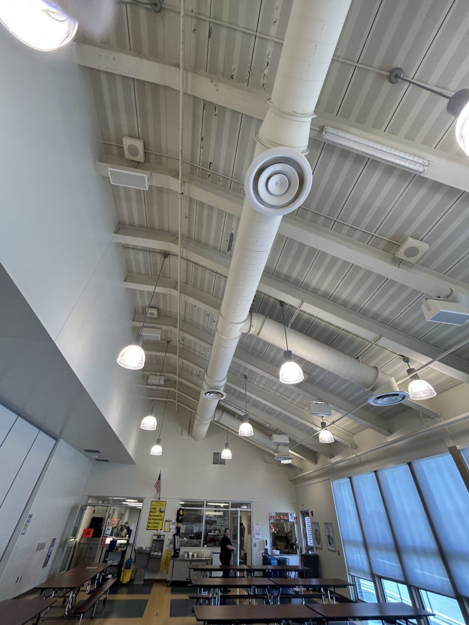 Working in a fully furnished cafeteria required extensive protection of floors and furniture to prevent overspray. A scissor lift was essential for reaching high areas safely and efficiently, allowing the team to work quickly without compromising quality.